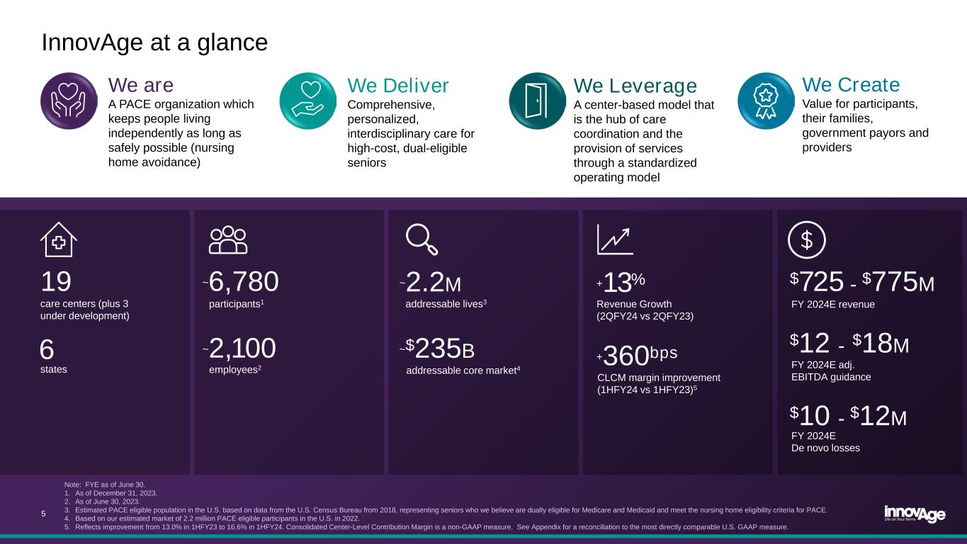 Investment highlights With focus and execution, we believe InnovAge can deliver attractive top-line growth at a long-term sustainable margin Focus on a largely untapped and growing market enabling frail seniors to remain independent by fully integrating Medicare and Medicaid services Powerful unit economics and quality outcomes driven by controlling more of the healthcare dollar than any other value-based care model Most sophisticated national PACE platform with best-in-class provider AND payor capabilities Management bench with extensive senior care experience in compliance and performance-oriented cultures 4 Recent investments coupled with meaningful center capacity create significant embedded earnings with visibility into strong organic growth and considerable margin expansion