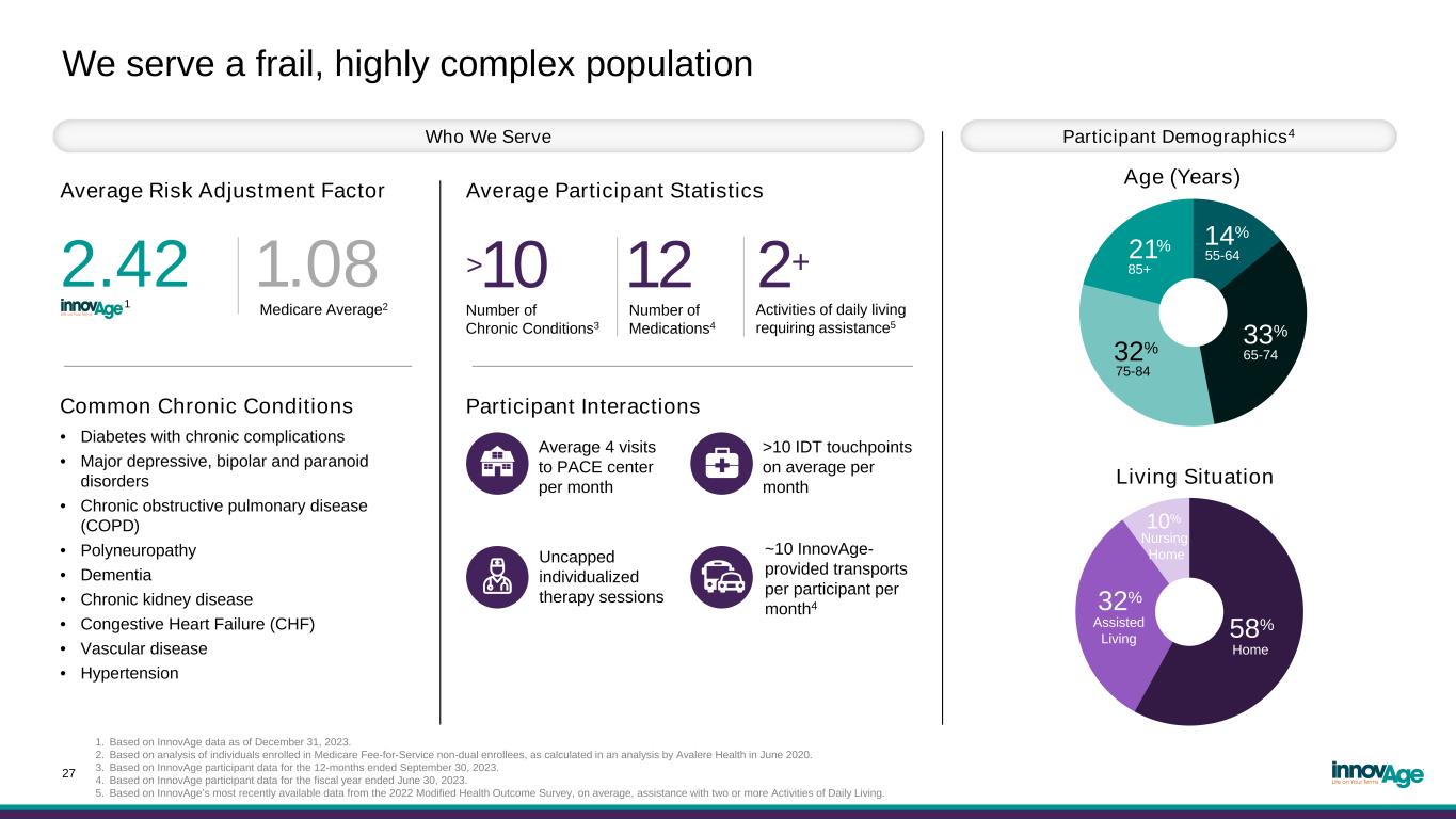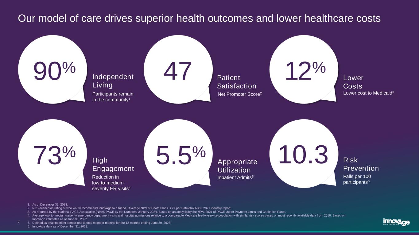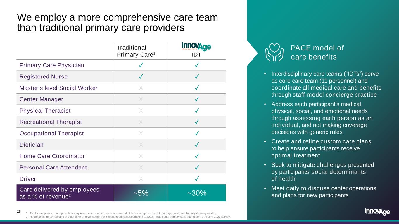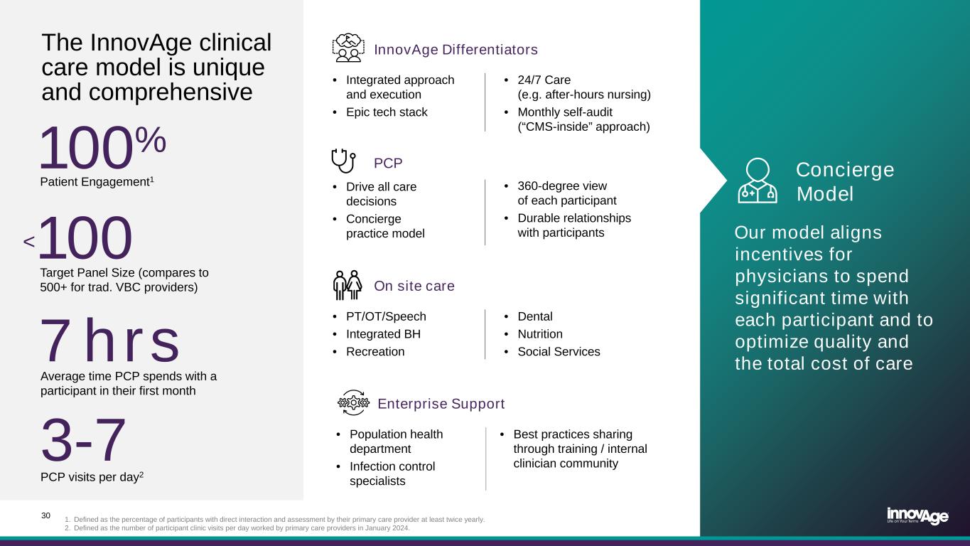 VB: reformatThe InnovAge clinical care model is unique and comprehensive 30 Target Panel Size (compares to 500+ for trad. VBC providers) Average time PCP spends with a participant in their first month InnovAge Differentiators • Integrated approach and execution • Epic tech stack • 24/7 Care (e.g. after-hours nursing) • Monthly self-audit (“CMS-inside” approach) PCP • Drive all care decisions • Concierge practice model • 360-degree view of each participant • Durable relationships with participants On site care • PT/OT/Speech • Integrated BH • Recreation • Dental • Nutrition • Social Services <100 7 hrs Enterprise Support • Population health department • Infection control specialists • Best practices sharing through training / internal clinician community Our model aligns incentives for physicians to spend significant time with each participant and to optimize quality and the total cost of care PCP visits per day2 3-7 100% Patient Engagement1 Concierge Model 1. Defined as the percentage of participants with direct interaction and assessment by their primary care provider at least twice yearly. 2. Defined as the number of participant clinic visits per day worked by primary care providers in January 2024.