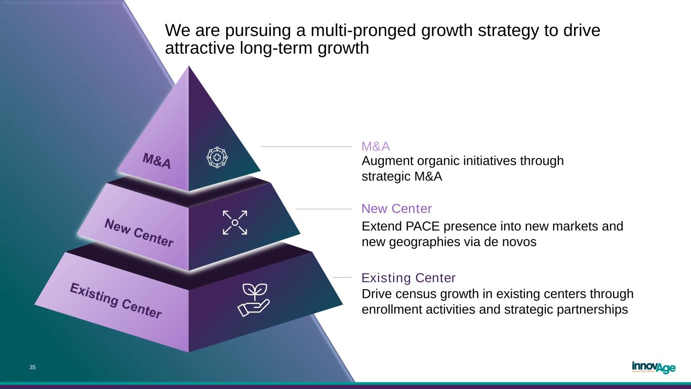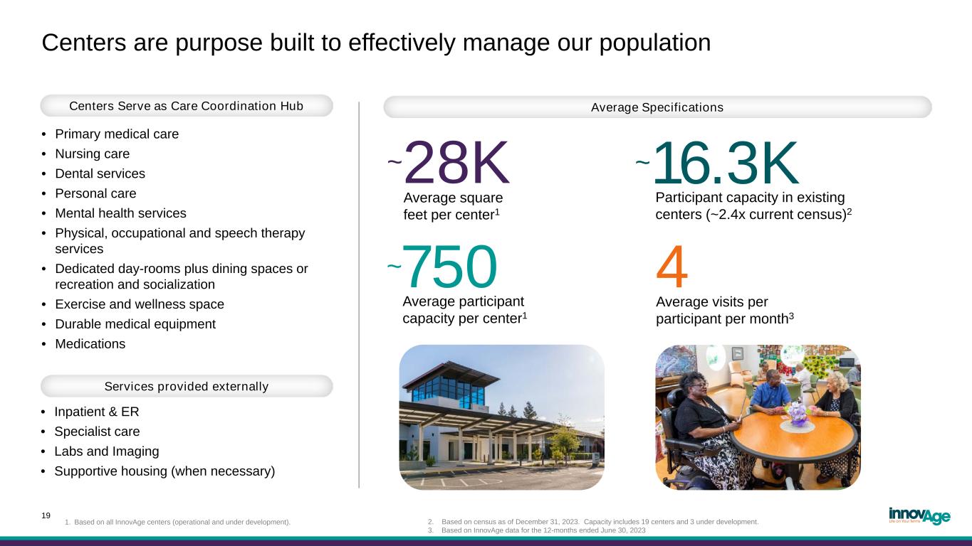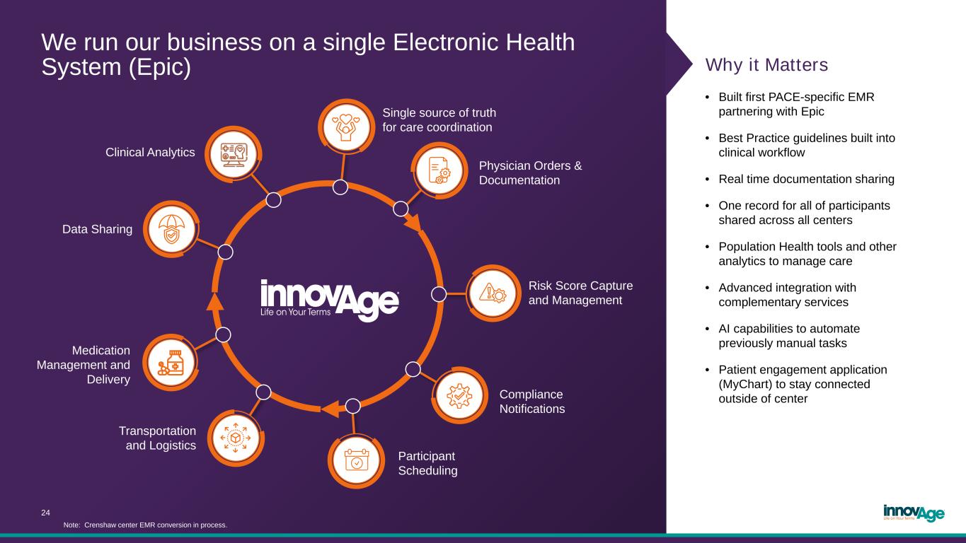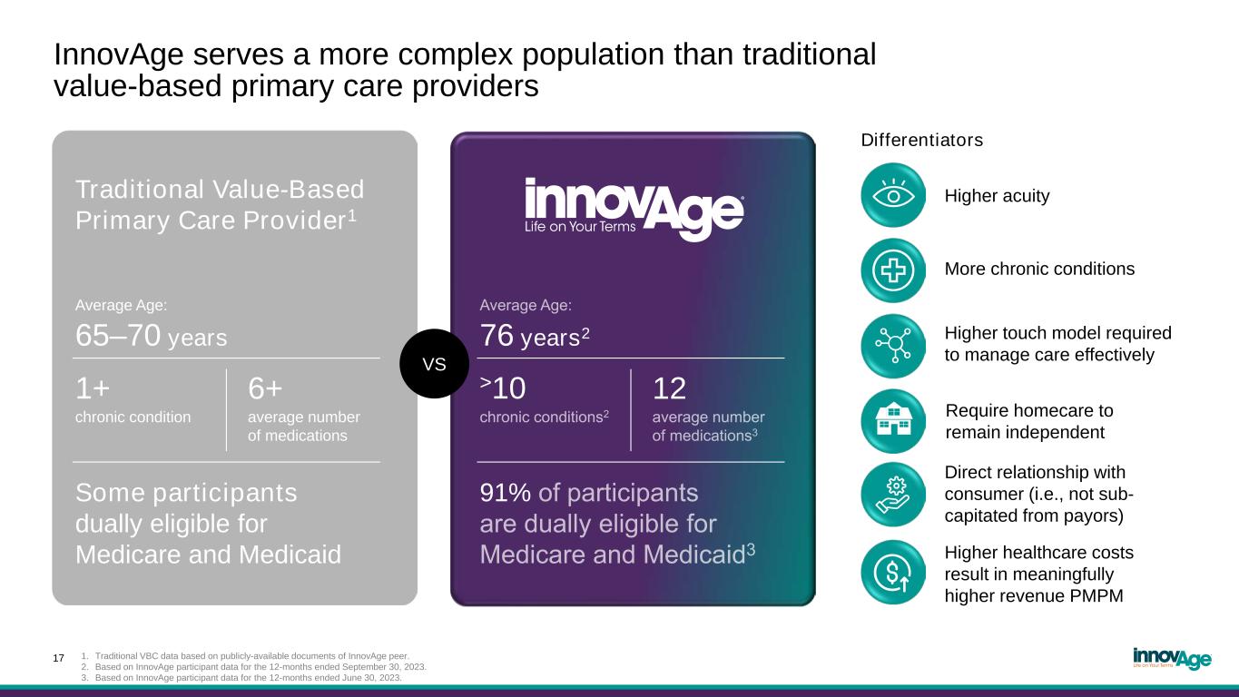 VB: reformatThe InnovAge clinical care model is unique and comprehensive 30 Target Panel Size (compares to 500+ for trad. VBC providers) Average time PCP spends with a participant in their first month InnovAge Differentiators • Integrated approach and execution • Epic tech stack • 24/7 Care (e.g. after-hours nursing) • Monthly self-audit (“CMS-inside” approach) PCP • Drive all care decisions • Concierge practice model • 360-degree view of each participant • Durable relationships with participants On site care • PT/OT/Speech • Integrated BH • Recreation • Dental • Nutrition • Social Services <100 7 hrs Enterprise Support • Population health department • Infection control specialists • Best practices sharing through training / internal clinician community Our model aligns incentives for physicians to spend significant time with each participant and to optimize quality and the total cost of care PCP visits per day2 3-7 100% Patient Engagement1 Concierge Model 1. Defined as the percentage of participants with direct interaction and assessment by their primary care provider at least twice yearly. 2. Defined as the number of participant clinic visits per day worked by primary care providers in January 2024.
