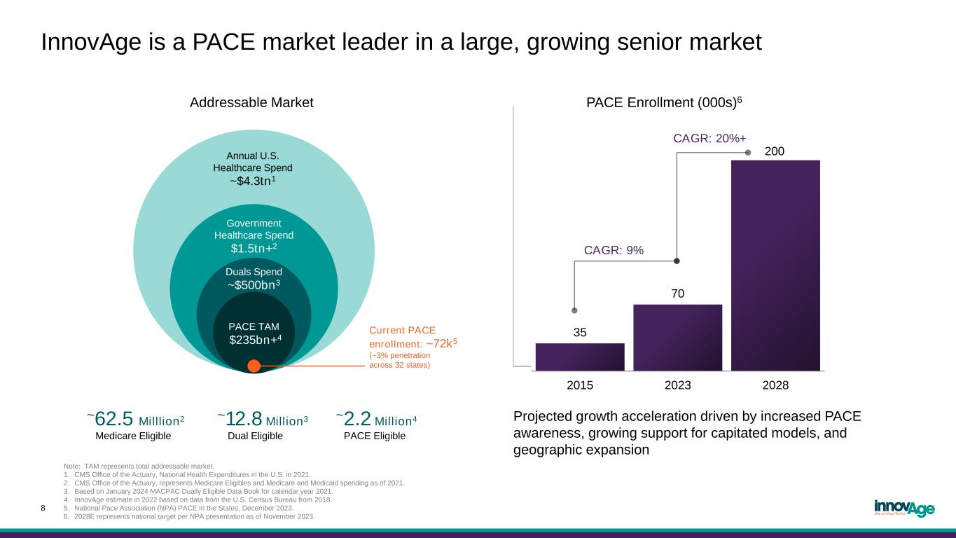 1. As of December 31, 2023. 2. NPS defined as rating of who would recommend InnovAge to a friend. Average NPS of Heath Plans is 27 per Satmetrix NICE 2021 industry report. 3. As reported by the National PACE Association (NPA), PACE by the Numbers, January 2024. Based on an analysis by the NPA, 2021 of PACE Upper Payment Limits and Capitation Rates. 4. Average low- to medium-severity emergency department visits and hospital admissions relative to a comparable Medicare fee-for-service population with similar risk scores based on most recently available data from 2018. Based on InnovAge estimates as of June 30, 2022. 5. Defined as total inpatient admissions to total member months for the 12-months ending June 30, 2023. 6. InnovAge data as of December 31, 2023. 7 Our model of care drives superior health outcomes and lower healthcare costs Participants remain in the community1 Net Promoter Score2 Lower cost to Medicaid3 Reduction in low-to-medium severity ER visits4 90% 47 73% 12% Independent Living Patient Satisfaction Lower Costs High Engagement 5.5% 10.3Appropriate Utilization Risk Prevention Inpatient Admits5 Falls per 100 participants6