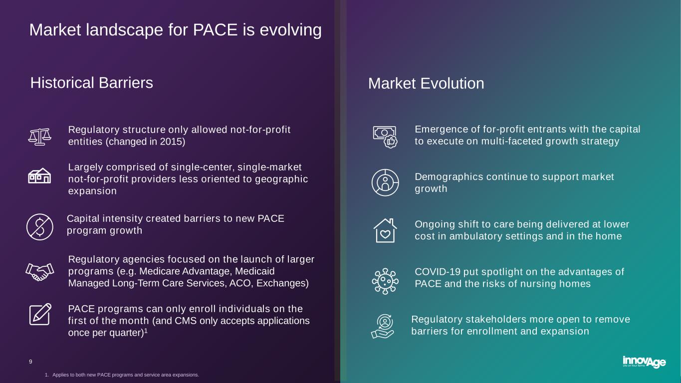 Market EvolutionHistorical Barriers Market landscape for PACE is evolving 9 Regulatory structure only allowed not-for-profit entities (changed in 2015) Largely comprised of single-center, single-market not-for-profit providers less oriented to geographic expansion Capital intensity created barriers to new PACE program growth Regulatory agencies focused on the launch of larger programs (e.g. Medicare Advantage, Medicaid Managed Long-Term Care Services, ACO, Exchanges) Demographics continue to support market growth Ongoing shift to care being delivered at lower cost in ambulatory settings and in the home COVID-19 put spotlight on the advantages of PACE and the risks of nursing homes Emergence of for-profit entrants with the capital to execute on multi-faceted growth strategy Regulatory stakeholders more open to remove barriers for enrollment and expansion PACE programs can only enroll individuals on the first of the month (and CMS only accepts applications once per quarter)1 1. Applies to both new PACE programs and service area expansions.