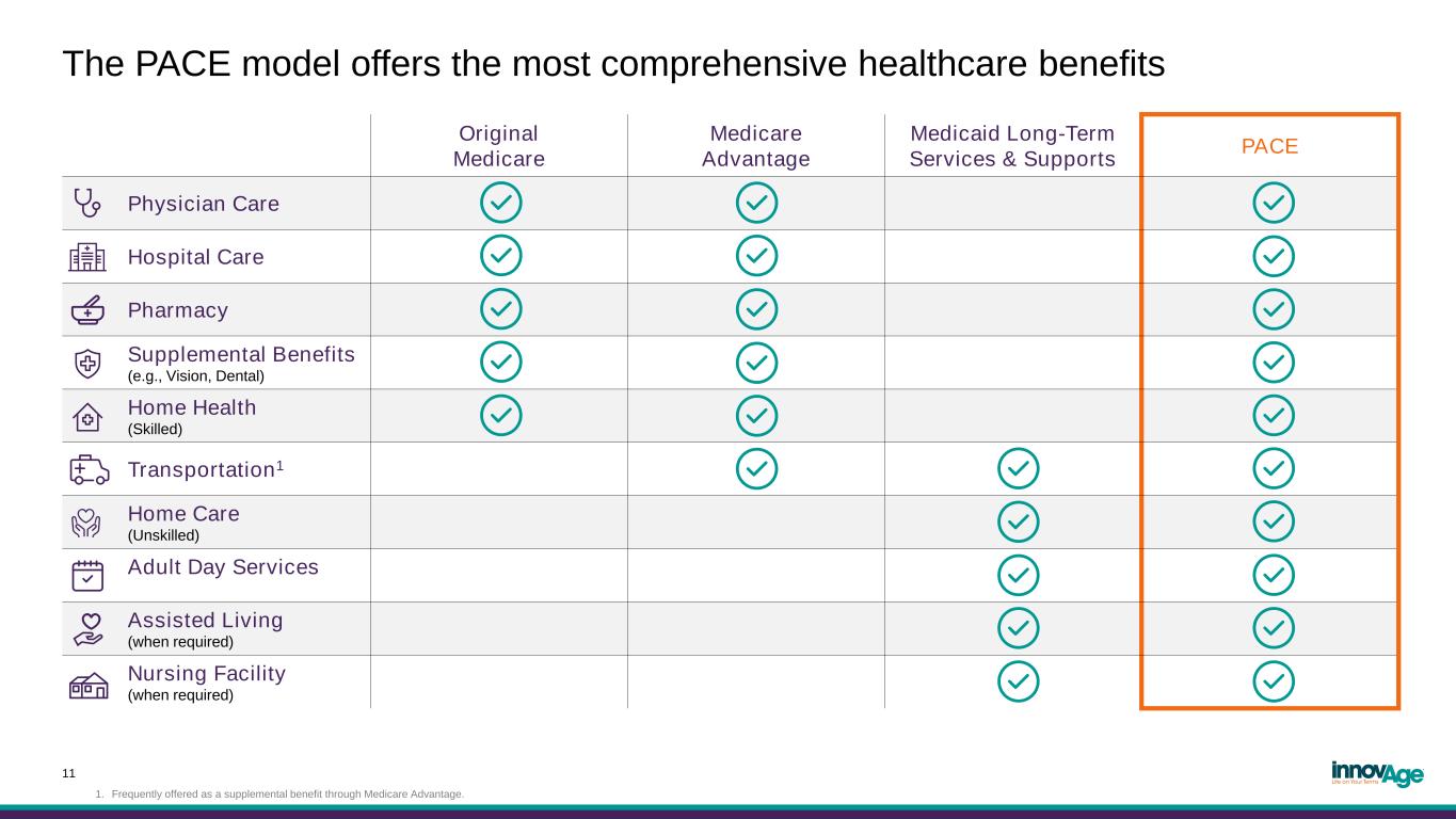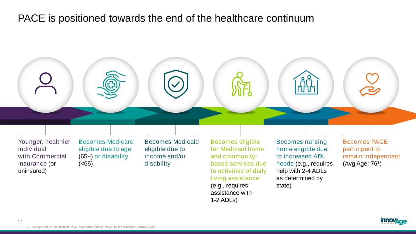PACE is positioned towards the end of the healthcare continuum 1. As reported by the National PACE Association (NPA), PACE by the Numbers, January 2024. Younger, healthier, individual with Commercial Insurance (or uninsured) Becomes Medicare eligible due to age (65+) or disability (<65) Becomes Medicaid eligible due to income and/or disability Becomes eligible for Medicaid home and community- based services due to activities of daily living assistance (e.g., requires assistance with 1-2 ADLs) Becomes nursing home eligible due to increased ADL needs (e.g., requires help with 2-4 ADLs as determined by state) Becomes PACE participant to remain independent (Avg Age: 761) 10