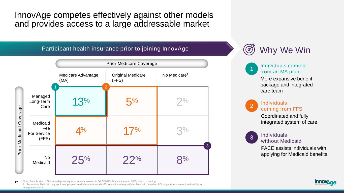 Medicare Advantage (MA) Original Medicare (FFS) No Medicare1 Managed Long-Term Care Medicaid Fee For Service (FFS) No Medicaid Prior Medicare Coverage InnovAge competes effectively against other models and provides access to a large addressable market Note: Sample size of 581 InnovAge survey respondents taken in in Q4 FY2023. Does not sum to 100% due to rounding. 1. Represents Medicaid only portion of population which includes under 65 population who qualify for Medicaid based on ADL support requirement, a disability, or immigration status. Why We Win 1 2 3 Individuals coming from an MA plan More expansive benefit package and integrated care team Individuals coming from FFS Coordinated and fully integrated system of care Individuals without Medicaid PACE assists individuals with applying for Medicaid benefits 13% 5% 17%4% 2% 3% 22%25% 1 2 8% 3 12 Pr io r M ed ic ai d C ov er ag e Participant health insurance prior to joining InnovAge