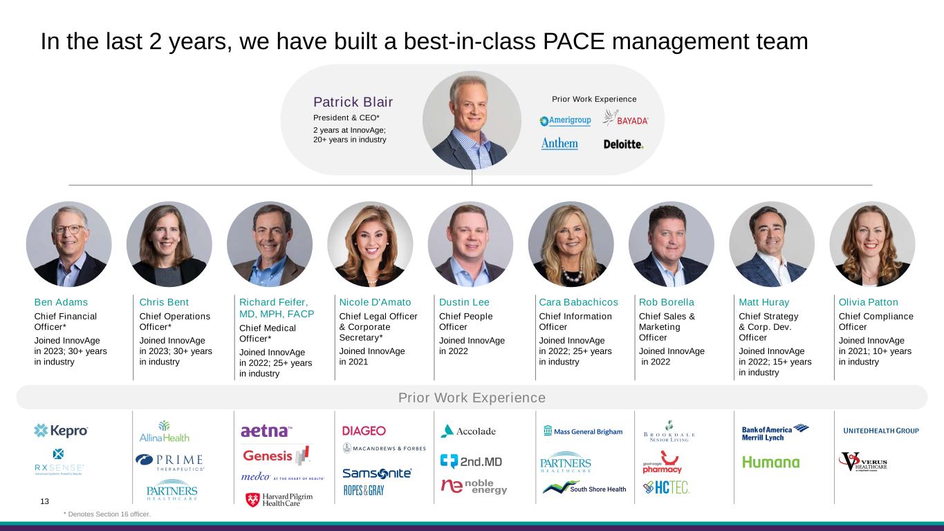 In the last 2 years, we have built a best-in-class PACE management team Patrick Blair President & CEO* 2 years at InnovAge; 20+ years in industry Ben Adams Chief Financial Officer* Joined InnovAge in 2023; 30+ years in industry Chris Bent Chief Operations Officer* Joined InnovAge in 2023; 30+ years in industry Richard Feifer, MD, MPH, FACP Chief Medical Officer* Joined InnovAge in 2022; 25+ years in industry Nicole D'Amato Chief Legal Officer & Corporate Secretary* Joined InnovAge in 2021 Dustin Lee Chief People Officer Joined InnovAge in 2022 Cara Babachicos Chief Information Officer Joined InnovAge in 2022; 25+ years in industry Rob Borella Chief Sales & Marketing Officer Joined InnovAge in 2022 Matt Huray Chief Strategy & Corp. Dev. Officer Joined InnovAge in 2022; 15+ years in industry Olivia Patton Chief Compliance Officer Joined InnovAge in 2021; 10+ years in industry Prior Work Experience Prior Work Experience 13 * Denotes Section 16 officer.