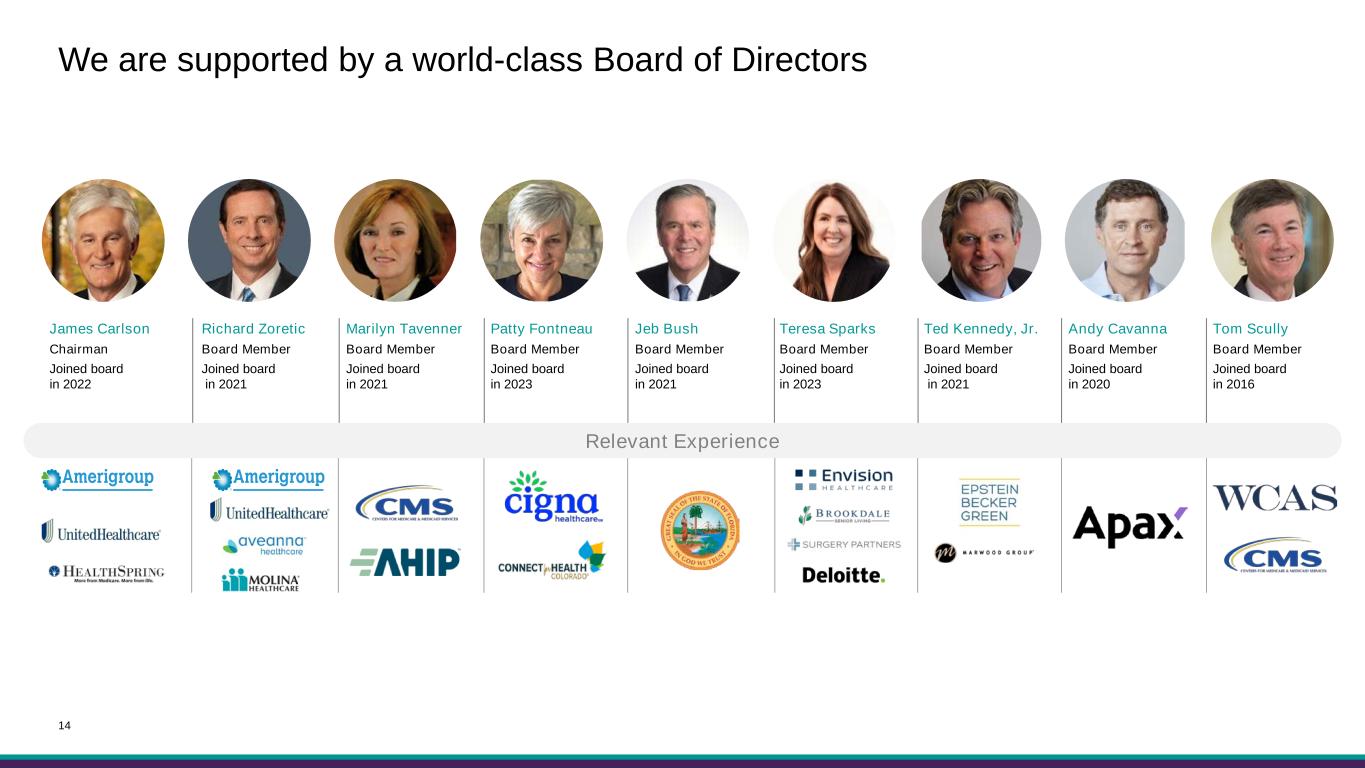We are supported by a world-class Board of Directors James Carlson Chairman Joined board in 2022 Richard Zoretic Board Member Joined board in 2021 Marilyn Tavenner Board Member Joined board in 2021 Patty Fontneau Board Member Joined board in 2023 Jeb Bush Board Member Joined board in 2021 Teresa Sparks Board Member Joined board in 2023 Ted Kennedy, Jr. Board Member Joined board in 2021 Andy Cavanna Board Member Joined board in 2020 Tom Scully Board Member Joined board in 2016 Relevant Experience 14
