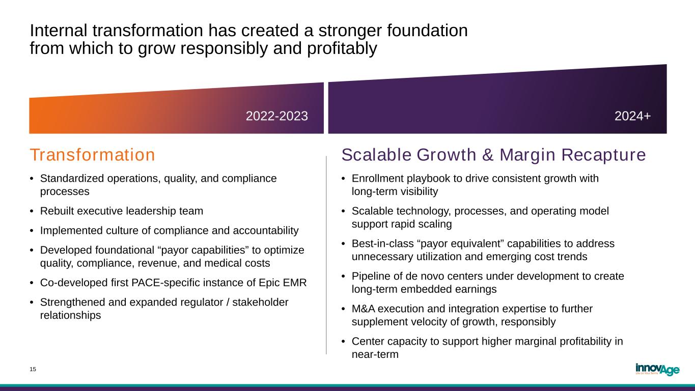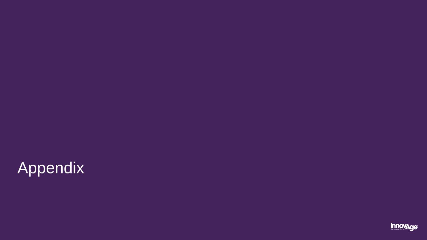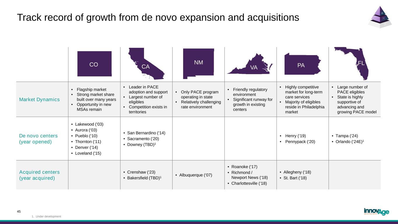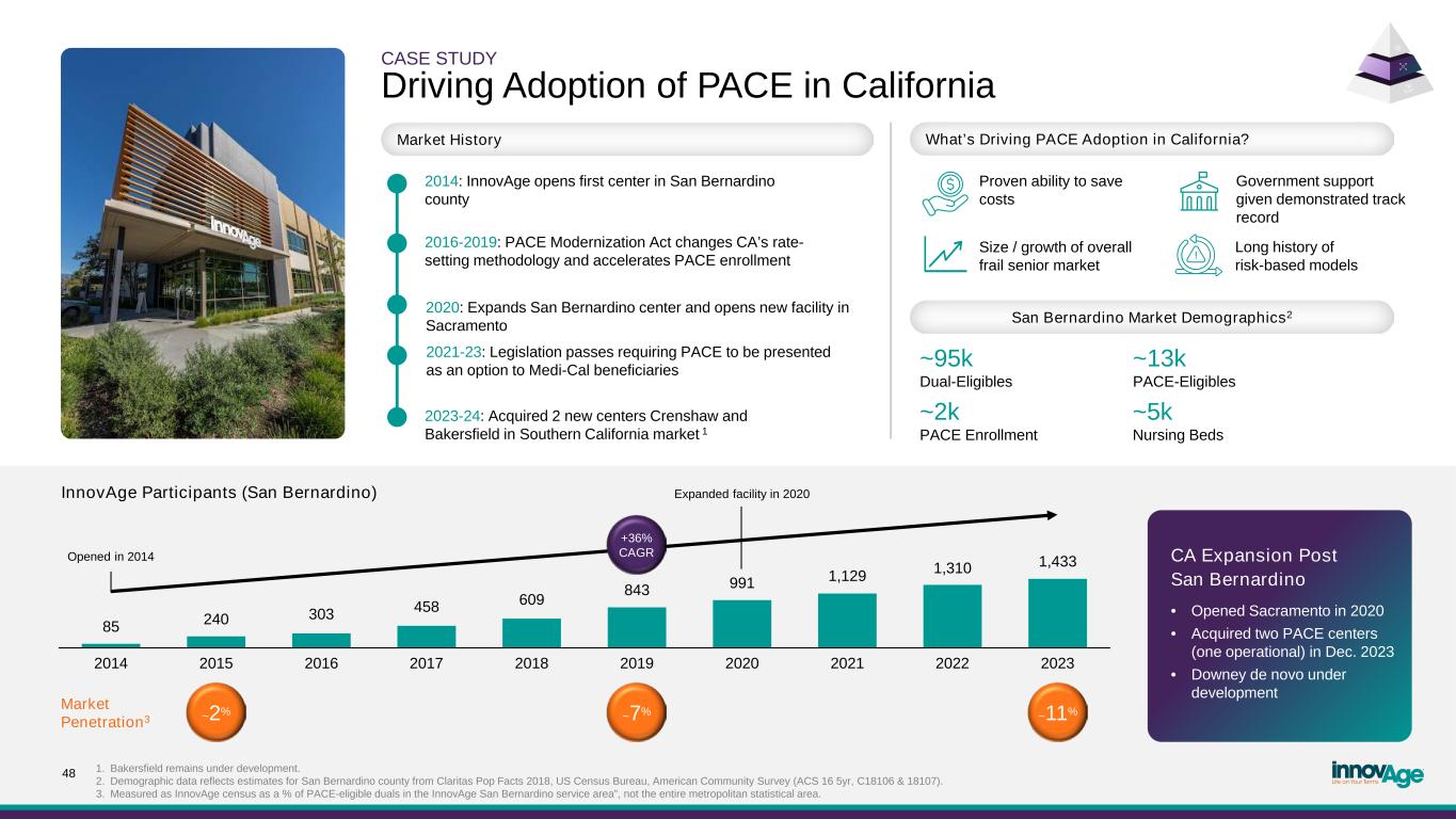 CASE STUDY Driving Adoption of PACE in California 1. Bakersfield remains under development. 2. Demographic data reflects estimates for San Bernardino county from Claritas Pop Facts 2018, US Census Bureau, American Community Survey (ACS 16 5yr, C18106 & 18107). 3. Measured as InnovAge census as a % of PACE-eligible duals in the InnovAge San Bernardino service area”, not the entire metropolitan statistical area. InnovAge Participants (San Bernardino) 48 85 240 303 458 609 843 991 1,129 1,310 1,433 2014 2015 2016 2017 2018 2019 2020 2021 2022 2023 +36% CAGR Market Penetration3 Market History What’s Driving PACE Adoption in California? CA Expansion Post San Bernardino • Opened Sacramento in 2020 • Acquired two PACE centers (one operational) in Dec. 2023 • Downey de novo under development 2014: InnovAge opens first center in San Bernardino county 2016-2019: PACE Modernization Act changes CA’s rate- setting methodology and accelerates PACE enrollment 2020: Expands San Bernardino center and opens new facility in Sacramento 2021-23: Legislation passes requiring PACE to be presented as an option to Medi-Cal beneficiaries 2023-24: Acquired 2 new centers Crenshaw and Bakersfield in Southern California market 1 ~95k Dual-Eligibles ~13k PACE-Eligibles ~2k PACE Enrollment ~5k Nursing Beds Proven ability to save costs Size / growth of overall frail senior market Government support given demonstrated track record San Bernardino Market Demographics2 Long history of risk-based models Expanded facility in 2020 Opened in 2014 ~2% ~7% ~11%
