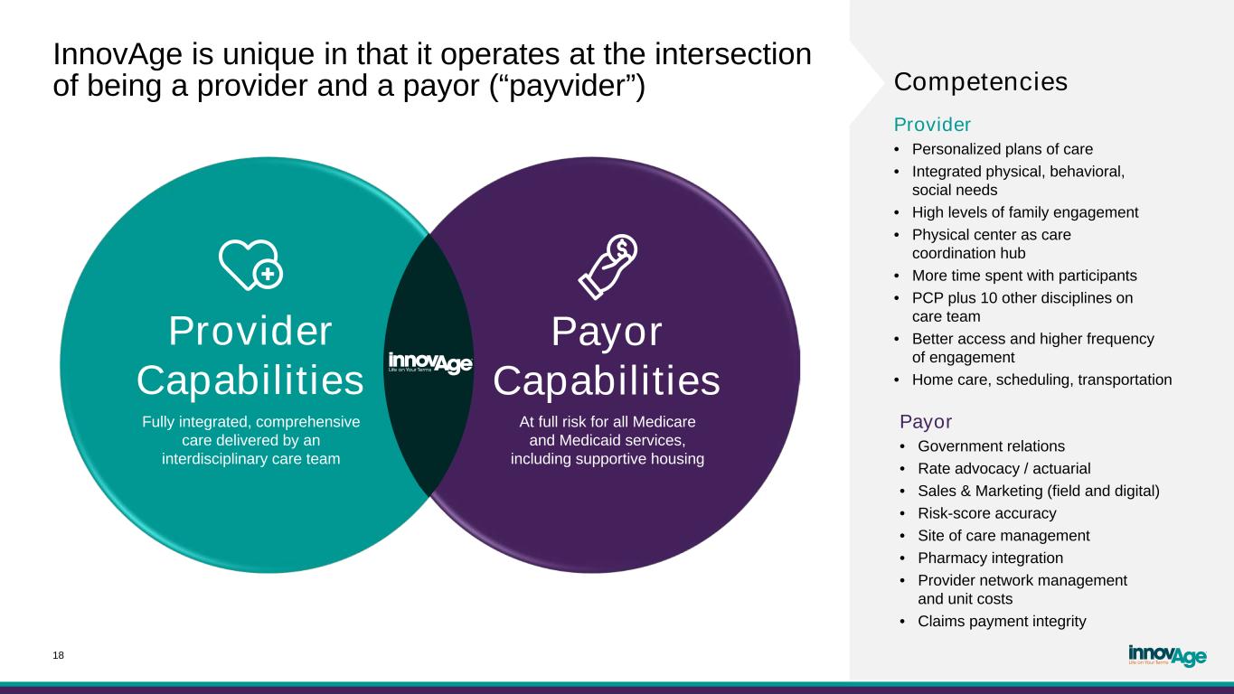 Higher acuity More chronic conditions Higher healthcare costs result in meaningfully higher revenue PMPM InnovAge serves a more complex population than traditional value-based primary care providers Traditional Value-Based Primary Care Provider1 Average Age: 1. Traditional VBC data based on publicly-available documents of InnovAge peer. 2. Based on InnovAge participant data for the 12-months ended September 30, 2023. 3. Based on InnovAge participant data for the 12-months ended June 30, 2023. 65–70 years 1+ chronic condition 6+ average number of medications Some participants dually eligible for Medicare and Medicaid 76 years2 >10 12 91% VS Differentiators 17 Require homecare to remain independent Direct relationship with consumer (i.e., not sub- capitated from payors) Higher touch model required to manage care effectively