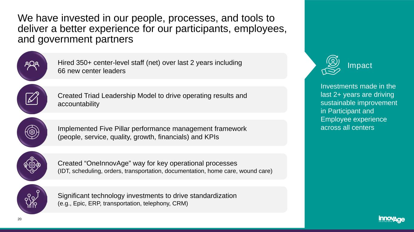 We have invested in our people, processes, and tools to deliver a better experience for our participants, employees, and government partners Significant technology investments to drive standardization (e.g., Epic, ERP, transportation, telephony, CRM) Investments made in the last 2+ years are driving sustainable improvement in Participant and Employee experience across all centersImplemented Five Pillar performance management framework (people, service, quality, growth, financials) and KPIs Created “OneInnovAge” way for key operational processes (IDT, scheduling, orders, transportation, documentation, home care, wound care) ImpactHired 350+ center-level staff (net) over last 2 years including 66 new center leaders Created Triad Leadership Model to drive operating results and accountability 20