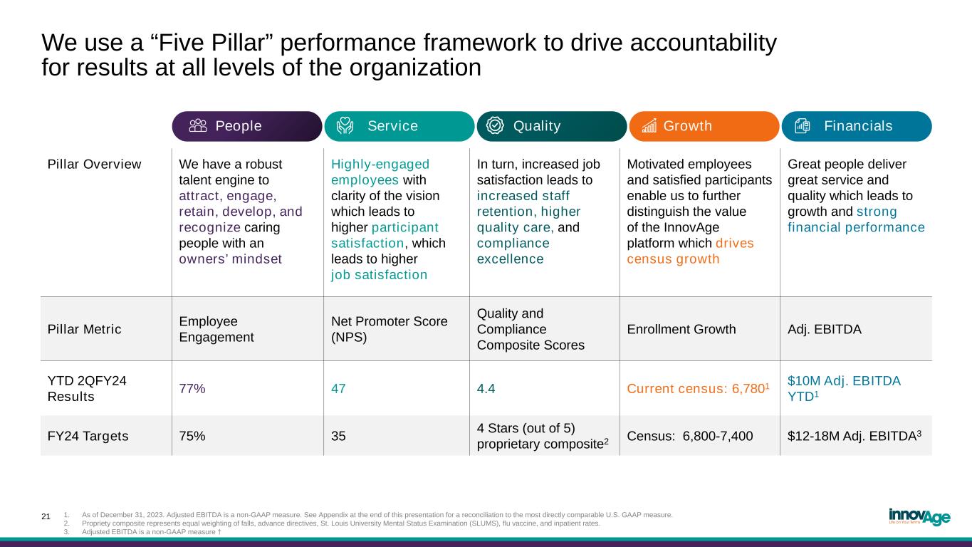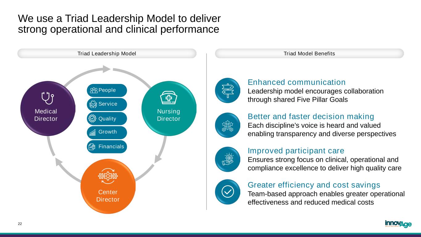 We use a “Five Pillar” performance framework to drive accountability for results at all levels of the organization 21 1. As of December 31, 2023. Adjusted EBITDA is a non-GAAP measure. See Appendix at the end of this presentation for a reconciliation to the most directly comparable U.S. GAAP measure. 2. Propriety composite represents equal weighting of falls, advance directives, St. Louis University Mental Status Examination (SLUMS), flu vaccine, and inpatient rates. 3. Adjusted EBITDA is a non-GAAP measure † People Service Quality Growth Financials Pillar Overview We have a robust talent engine to attract, engage, retain, develop, and recognize caring people with an owners’ mindset Highly-engaged employees with clarity of the vision which leads to higher participant satisfaction, which leads to higher job satisfaction In turn, increased job satisfaction leads to increased staff retention, higher quality care, and compliance excellence Motivated employees and satisfied participants enable us to further distinguish the value of the InnovAge platform which drives census growth Great people deliver great service and quality which leads to growth and strong financial performance Pillar Metric Employee Engagement Net Promoter Score (NPS) Quality and Compliance Composite Scores Enrollment Growth Adj. EBITDA YTD 2QFY24 Results 77% 47 4.4 Current census: 6,7801 $10M Adj. EBITDA YTD1 FY24 Targets 75% 35 4 Stars (out of 5) proprietary composite2 Census: 6,800-7,400 $12-18M Adj. EBITDA3