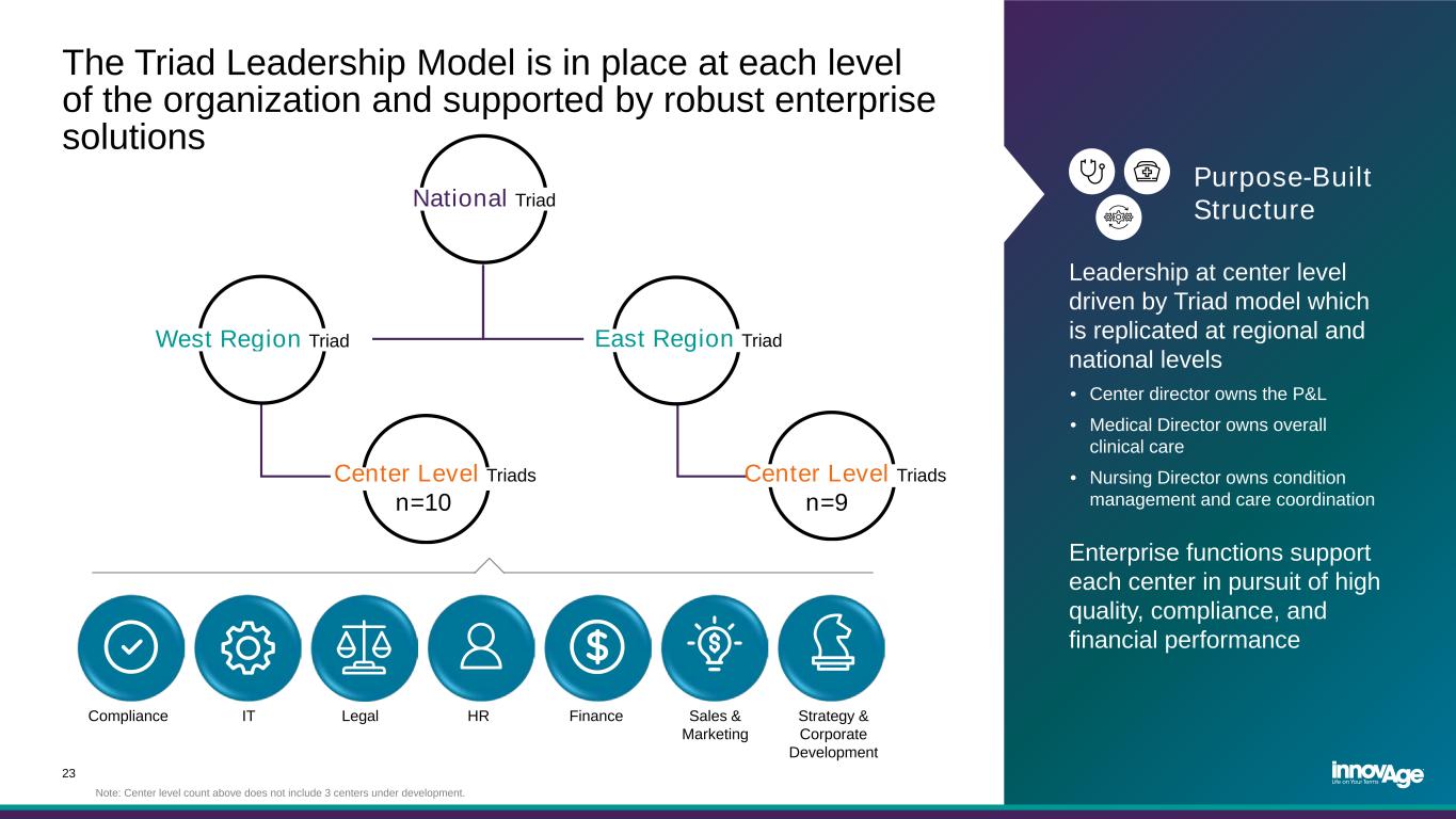 The Triad Leadership Model is in place at each level of the organization and supported by robust enterprise solutions Purpose-Built Structure Leadership at center level driven by Triad model which is replicated at regional and national levels • Center director owns the P&L • Medical Director owns overall clinical care • Nursing Director owns condition management and care coordination Enterprise functions support each center in pursuit of high quality, compliance, and financial performance FinanceIT Legal HR Sales & Marketing Strategy & Corporate Development 23 Note: Center level count above does not include 3 centers under development. East Region Triad National Triad West Region Triad Center Level Triads n=10 Center Level Triads n=9 Compliance