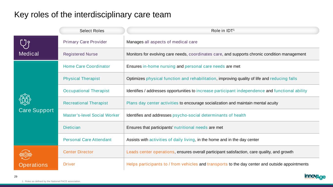 Key roles of the interdisciplinary care team 1. Roles as defined by the National PACE association. 29 Primary Care Provider Manages all aspects of medical care Registered Nurse Monitors for evolving care needs, coordinates care, and supports chronic condition management Home Care Coordinator Ensures in-home nursing and personal care needs are met Physical Therapist Optimizes physical function and rehabilitation, improving quality of life and reducing falls Occupational Therapist Identifies / addresses opportunities to increase participant independence and functional ability Recreational Therapist Plans day center activities to encourage socialization and maintain mental acuity Master’s-level Social Worker Identifies and addresses psycho-social determinants of health Dietician Ensures that participants’ nutritional needs are met Personal Care Attendant Assists with activities of daily living, in the home and in the day center Center Director Leads center operations, ensures overall participant satisfaction, care quality, and growth Driver Helps participants to / from vehicles and transports to the day center and outside appointmentsOperations Care Support Medical Role in IDT1Select Roles