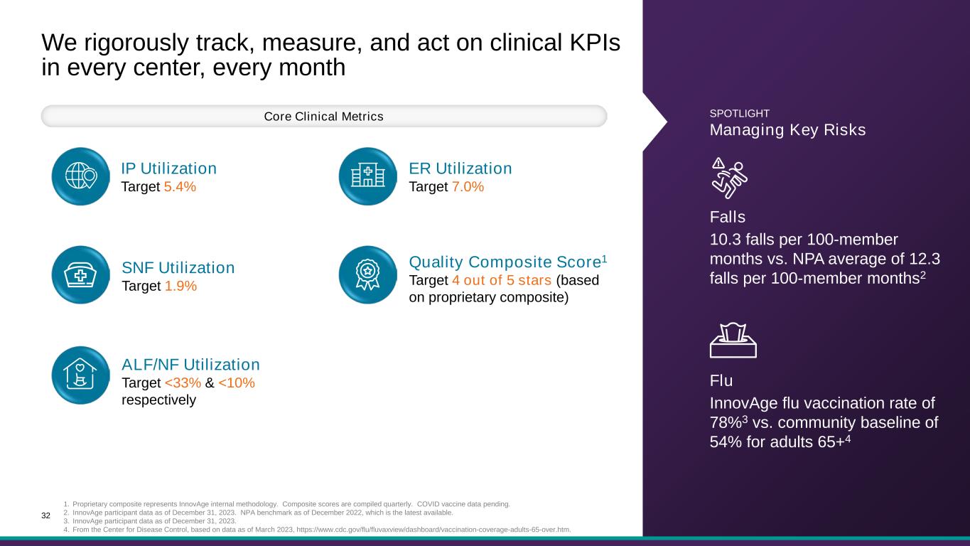 We rigorously track, measure, and act on clinical KPIs in every center, every month Core Clinical Metrics 1. Proprietary composite represents InnovAge internal methodology. Composite scores are compiled quarterly. COVID vaccine data pending. 2. InnovAge participant data as of December 31, 2023. NPA benchmark as of December 2022, which is the latest available. 3. InnovAge participant data as of December 31, 2023. 4. From the Center for Disease Control, based on data as of March 2023, https://www.cdc.gov/flu/fluvaxview/dashboard/vaccination-coverage-adults-65-over.htm. 32 Falls 10.3 falls per 100-member months vs. NPA average of 12.3 falls per 100-member months2 Flu InnovAge flu vaccination rate of 78%3 vs. community baseline of 54% for adults 65+4 ER Utilization Target 7.0% SPOTLIGHT Managing Key Risks IP Utilization Target 5.4% Quality Composite Score1 Target 4 out of 5 stars (based on proprietary composite) SNF Utilization Target 1.9% ALF/NF Utilization Target <33% & <10% respectively