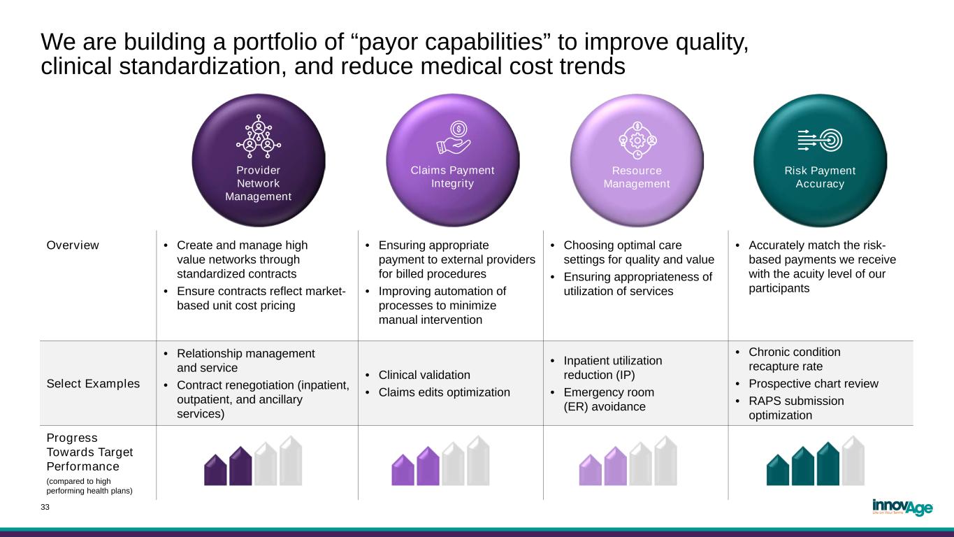 We are building a portfolio of “payor capabilities” to improve quality, clinical standardization, and reduce medical cost trends 33 Claims Payment Integrity Provider Network Management Resource Management Risk Payment Accuracy Overview • Create and manage high value networks through standardized contracts • Ensure contracts reflect market- based unit cost pricing • Ensuring appropriate payment to external providers for billed procedures • Improving automation of processes to minimize manual intervention • Choosing optimal care settings for quality and value • Ensuring appropriateness of utilization of services • Accurately match the risk- based payments we receive with the acuity level of our participants Select Examples • Relationship management and service • Contract renegotiation (inpatient, outpatient, and ancillary services) • Clinical validation • Claims edits optimization • Inpatient utilization reduction (IP) • Emergency room (ER) avoidance • Chronic condition recapture rate • Prospective chart review • RAPS submission optimization Progress Towards Target Performance (compared to high performing health plans)