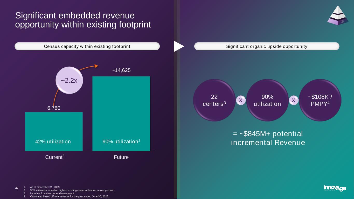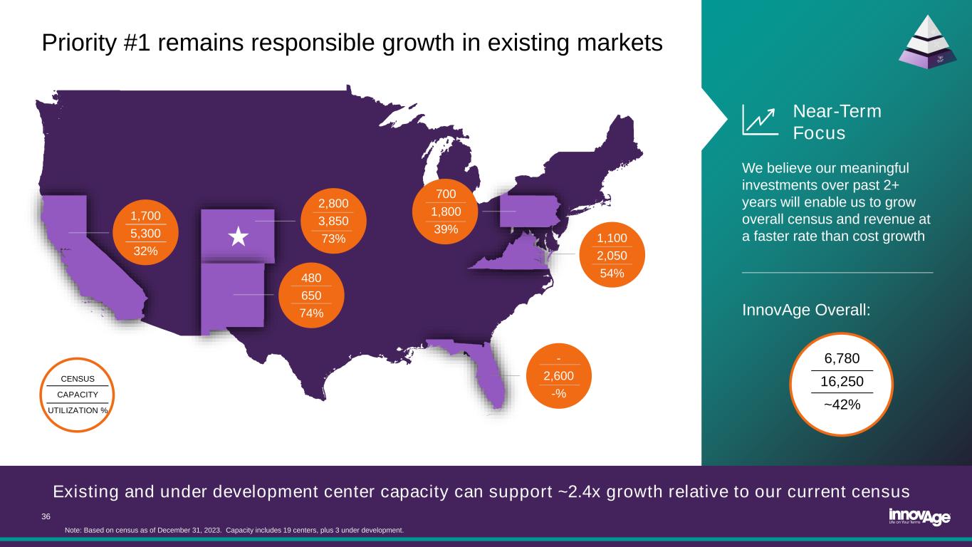 1,700 5,300 32% 2,800 3,850 73% 480 650 74% - 2,600 -% 700 1,800 39% 1,100 2,050 54% Note: Based on census as of December 31, 2023. Capacity includes 19 centers, plus 3 under development. Priority #1 remains responsible growth in existing markets We believe our meaningful investments over past 2+ years will enable us to grow overall census and revenue at a faster rate than cost growth 36 Existing and under development center capacity can support ~2.4x growth relative to our current census Near-Term Focus InnovAge Overall: CENSUS CAPACITY UTILIZATION % 6,780 16,250 ~42%