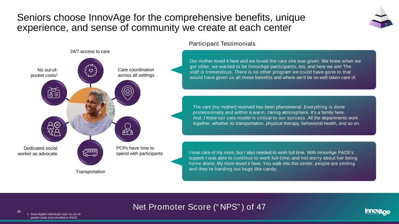 Seniors choose InnovAge for the comprehensive benefits, unique experience, and sense of community we create at each center The care [my mother] received has been phenomenal. Everything is done professionally and within a warm, caring atmosphere. It’s a family here. And, I know our care model is critical to our success. All the departments work together, whether its transportation, physical therapy, behavioral health, and so on. Care coordination across all settings 24/7 access to care PCPs have time to spend with participants Dedicated social worker as advocate No out-of- pocket costs1 Transportation Net Promoter Score (“NPS”) of 47 38 Our mother loved it here and we loved the care she was given. We knew when we got older, we wanted to be InnovAge participants, too, and here we are! The staff is tremendous. There is no other program we could have gone to that would have given us all these benefits and where we’d be so well taken care of. I took care of my mom, but I also needed to work full time. With InnovAge PACE’s support I was able to continue to work full-time, and not worry about her being home alone. My mom loved it here. You walk into this center, people are smiling and they’re handing out hugs like candy. 1. Dual eligible individuals have no out-of- pocket costs once enrolled in PACE. Participant Testimonials