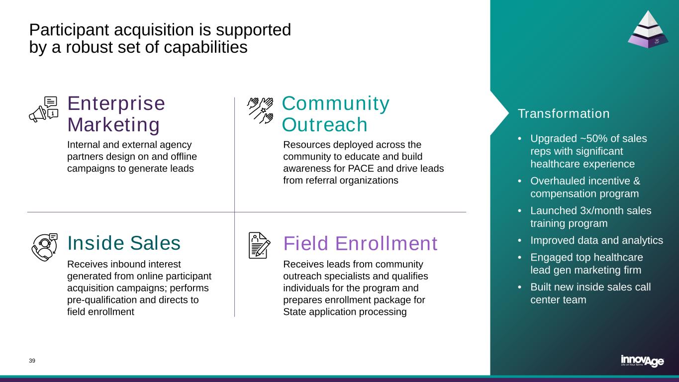 Participant acquisition is supported by a robust set of capabilities Internal and external agency partners design on and offline campaigns to generate leads Resources deployed across the community to educate and build awareness for PACE and drive leads from referral organizations Receives leads from community outreach specialists and qualifies individuals for the program and prepares enrollment package for State application processing Enterprise Marketing Community Outreach Field Enrollment Receives inbound interest generated from online participant acquisition campaigns; performs pre-qualification and directs to field enrollment Inside Sales • Upgraded ~50% of sales reps with significant healthcare experience • Overhauled incentive & compensation program • Launched 3x/month sales training program • Improved data and analytics • Engaged top healthcare lead gen marketing firm • Built new inside sales call center team 39 Transformation
