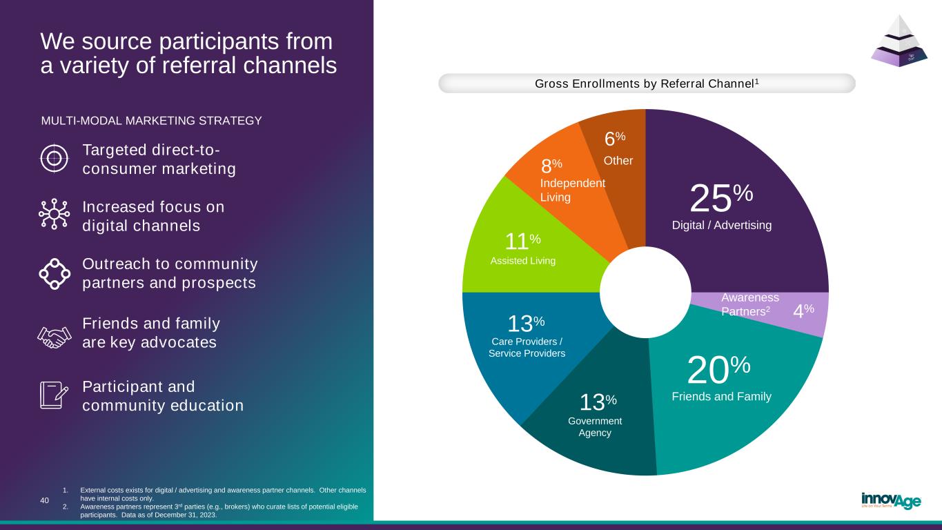 We source participants from a variety of referral channels Targeted direct-to- consumer marketing Increased focus on digital channels Outreach to community partners and prospects Friends and family are key advocates Participant and community education 1. External costs exists for digital / advertising and awareness partner channels. Other channels have internal costs only. 2. Awareness partners represent 3rd parties (e.g., brokers) who curate lists of potential eligible participants. Data as of December 31, 2023. MULTI-MODAL MARKETING STRATEGY 40 Gross Enrollments by Referral Channel1 25% 20% 13% 13% 11% 8% 4% 6% Digital / Advertising Government Agency Care Providers / Service Providers Assisted Living Independent Living Other Awareness Partners2 Friends and Family