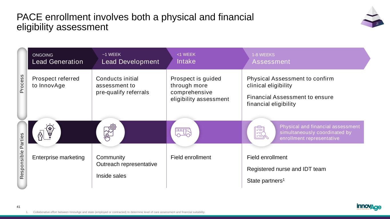 PACE enrollment involves both a physical and financial eligibility assessment 1. Collaborative effort between InnovAge and state (employed or contracted) to determine level of care assessment and financial suitability. Physical Assessment to confirm clinical eligibility Financial Assessment to ensure financial eligibility Prospect is guided through more comprehensive eligibility assessment Conducts initial assessment to pre-qualify referrals Prospect referred to InnovAge Enterprise marketing Field enrollment Registered nurse and IDT team State partners1 Lead Generation Lead Development Intake Assessment ONGOING ~1 WEEK <1 WEEK 1-8 WEEKS Community Outreach representative Inside sales Field enrollment 41 Physical and financial assessment simultaneously coordinated by enrollment representative PR O C ES S R es po ns ib le P ar tie s Pr oc es s