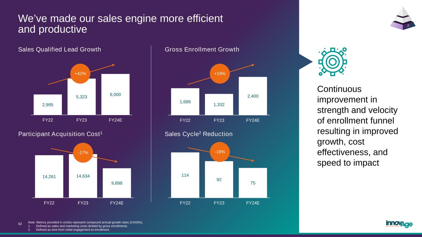 Continuous improvement in strength and velocity of enrollment funnel resulting in improved growth, cost effectiveness, and speed to impact We’ve made our sales engine more efficient and productive Sales Qualified Lead Growth Gross Enrollment Growth Sales Cycle2 Reduction 42 Note: Metrics provided in circles represent compound annual growth rates (CAGRs). 1. Defined as sales and marketing costs divided by gross enrollments. 2. Defined as time from initial engagement to enrollment. Participant Acquisition Cost1 2,995 5,323 6,000 FY22 FY23 FY24E +42% 14,261 14,634 9,898 FY22 FY23 FY24E -17% 1,689 1,332 2,400 FY22 FY23 FY24E +19% 114 92 75 FY22 FY23 FY24E -19%