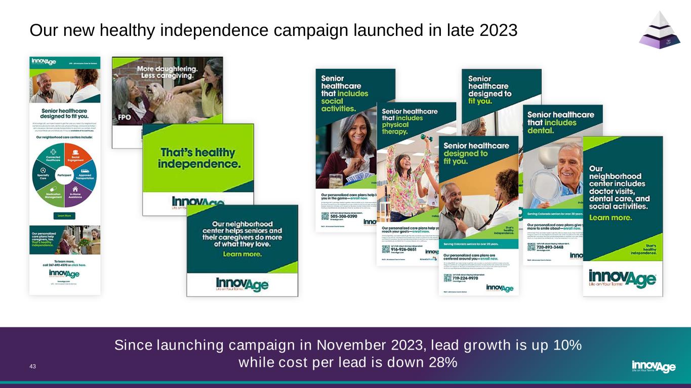 Our new healthy independence campaign launched in late 2023 Since launching campaign in November 2023, lead growth is up 10% while cost per lead is down 28% 43