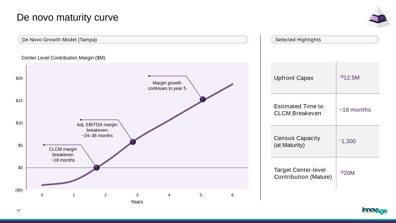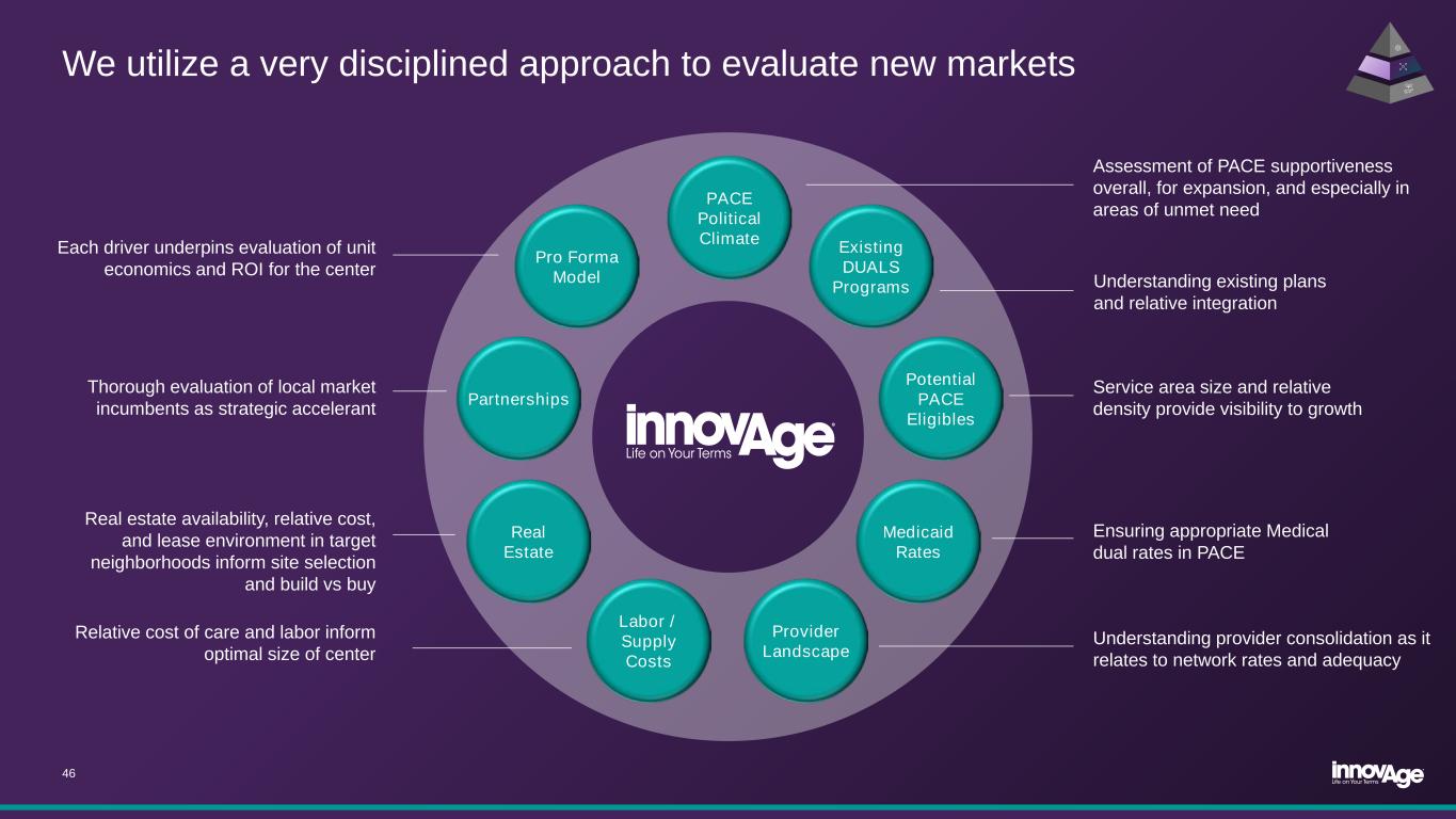 Market Dynamics • Flagship market • Strong market share built over many years • Opportunity in new MSAs remain • Leader in PACE adoption and support • Largest number of eligibles • Competition exists in territories • Only PACE program operating in state • Relatively challenging rate environment • Friendly regulatory environment • Significant runway for growth in existing centers • Highly competitive market for long-term care services • Majority of eligibles reside in Philadelphia market • Large number of PACE eligibles • State is highly supportive of advancing and growing PACE model De novo centers (year opened) • Lakewood (‘03) • Aurora (‘03) • Pueblo (‘10) • Thornton (‘11) • Denver (‘14) • Loveland ('15) • San Bernardino (‘14) • Sacramento (‘20) • Downey (TBD)1 • Henry (‘19) • Pennypack (‘20) • Tampa (‘24) • Orlando (‘24E)1 Acquired centers (year acquired) • Crenshaw (‘23) • Bakersfield (TBD)1 • Albuquerque (‘07) • Roanoke (‘17) • Richmond / Newport News (‘18) • Charlottesville (‘18) • Allegheny (‘18) • St. Bart (‘18) Track record of growth from de novo expansion and acquisitions CA NMCO VA PA FL 1. Under development 45