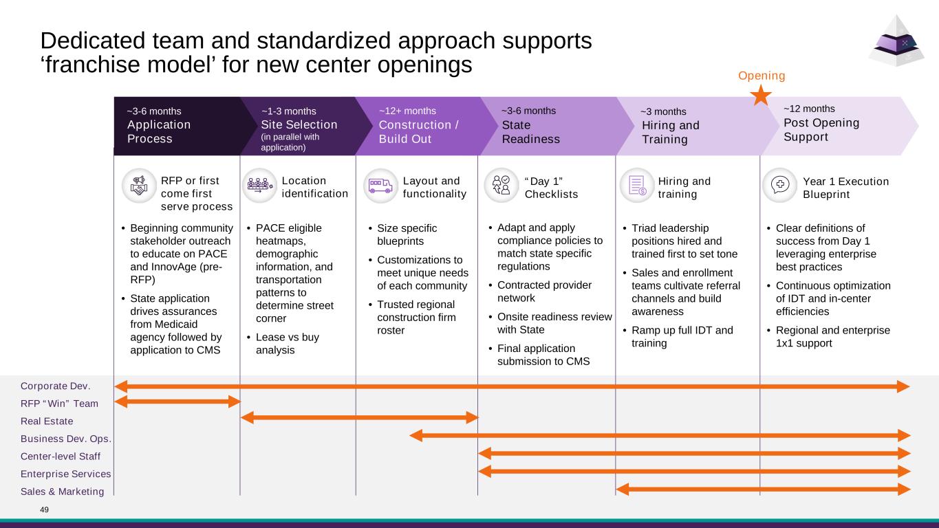 “Day 1” Checklists Layout and functionality RFP or first come first serve process Dedicated team and standardized approach supports ‘franchise model’ for new center openings Application Process Site Selection (in parallel with application) Construction / Build Out State Readiness ~3-6 months ~1-3 months ~12+ months ~3-6 months Hiring and Training ~3 months Post Opening Support ~12 months Opening Hiring and training Year 1 Execution Blueprint • PACE eligible heatmaps, demographic information, and transportation patterns to determine street corner • Lease vs buy analysis Location identification • Beginning community stakeholder outreach to educate on PACE and InnovAge (pre- RFP) • State application drives assurances from Medicaid agency followed by application to CMS • Size specific blueprints • Customizations to meet unique needs of each community • Trusted regional construction firm roster • Adapt and apply compliance policies to match state specific regulations • Contracted provider network • Onsite readiness review with State • Final application submission to CMS • Triad leadership positions hired and trained first to set tone • Sales and enrollment teams cultivate referral channels and build awareness • Ramp up full IDT and training • Clear definitions of success from Day 1 leveraging enterprise best practices • Continuous optimization of IDT and in-center efficiencies • Regional and enterprise 1x1 support Corporate Dev. RFP “Win” Team Real Estate Business Dev. Ops. Center-level Staff Enterprise Services Sales & Marketing 49