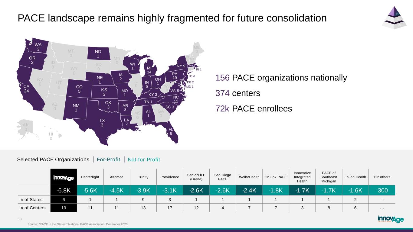 PACE landscape remains highly fragmented for future consolidation WA 3 OR 2 CA 24 ND 1 WY 0 NM 1 OK 3 TX 3 NE 1 CO 5 KS 3 IA 2 WI 1 MI 14 OH 1IN 5 PA 19 NY 9 LA 2 AR 3 TN 1 VA 8 NC 11 SC 3 FL 6 MD 1 DE 2 NJ 6 RI 1 AL 1 MA 8 KY 3 AZ 0 NV 0 UT 0 ID 0 MT 0 MN 0 IL 0 MO 1 SD 0 MS 0 GA 0 WV 0 ME 0 NH 0 VT 0 CT 0 Source: “PACE in the States,” National PACE Association, December 2023. Centerlight Altamed Trinity Providence SeniorLIFE (Grane) San Diego PACE WelbeHealth On Lok PACE Innovative Integrated Health PACE of Southeast Michigan Fallon Health 112 others ~6.8K ~5.6K ~4.5K ~3.9K ~3.1K ~2.6K ~2.6K ~2.4K ~1.8K ~1.7K ~1.7K ~1.6K ~300 # of States 6 1 1 9 3 1 1 1 1 1 1 2 - - # of Centers 19 11 11 13 17 12 4 7 7 3 8 6 - - For-ProfitSelected PACE Organizations Not-for-Profit 50 156 PACE organizations nationally 374 centers 72k PACE enrollees AK 0 HI 0