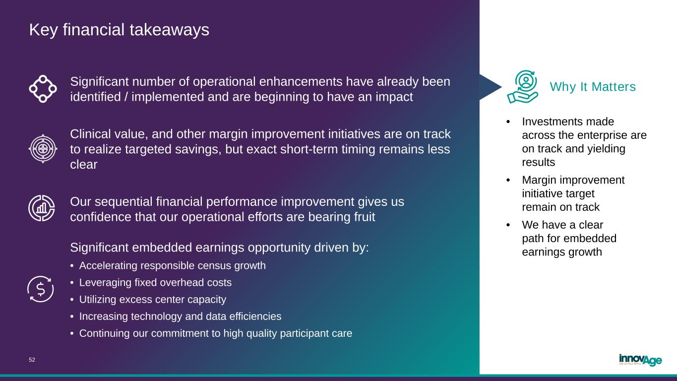Key financial takeaways Significant number of operational enhancements have already been identified / implemented and are beginning to have an impact Clinical value, and other margin improvement initiatives are on track to realize targeted savings, but exact short-term timing remains less clear Our sequential financial performance improvement gives us confidence that our operational efforts are bearing fruit Significant embedded earnings opportunity driven by: • Accelerating responsible census growth • Leveraging fixed overhead costs • Utilizing excess center capacity • Increasing technology and data efficiencies • Continuing our commitment to high quality participant care 52 • Investments made across the enterprise are on track and yielding results • Margin improvement initiative target remain on track • We have a clear path for embedded earnings growth Why It Matters