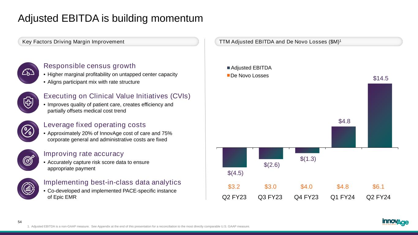 Adjusted EBITDA is building momentum 1. Adjusted EBITDA is a non-GAAP measure. See Appendix at the end of this presentation for a reconciliation to the most directly comparable U.S. GAAP measure. 54 TTM Adjusted EBITDA and De Novo Losses ($M)1Key Factors Driving Margin Improvement Responsible census growth • Higher marginal profitability on untapped center capacity • Aligns participant mix with rate structure Executing on Clinical Value Initiatives (CVIs) • Improves quality of patient care, creates efficiency and partially offsets medical cost trend Leverage fixed operating costs • Approximately 20% of InnovAge cost of care and 75% corporate general and administrative costs are fixed Improving rate accuracy • Accurately capture risk score data to ensure appropriate payment Implementing best-in-class data analytics • Co-developed and implemented PACE-specific instance of Epic EMR $(4.5) $(2.6) $(1.3) $4.8 $14.5 Adjusted EBITDA Q2 FY23 Q3 FY23 Q4 FY23 Q1 FY24 Q2 FY24 $3.2 $3.0 $4.0 $4.8 $6.1 De Novo Losses