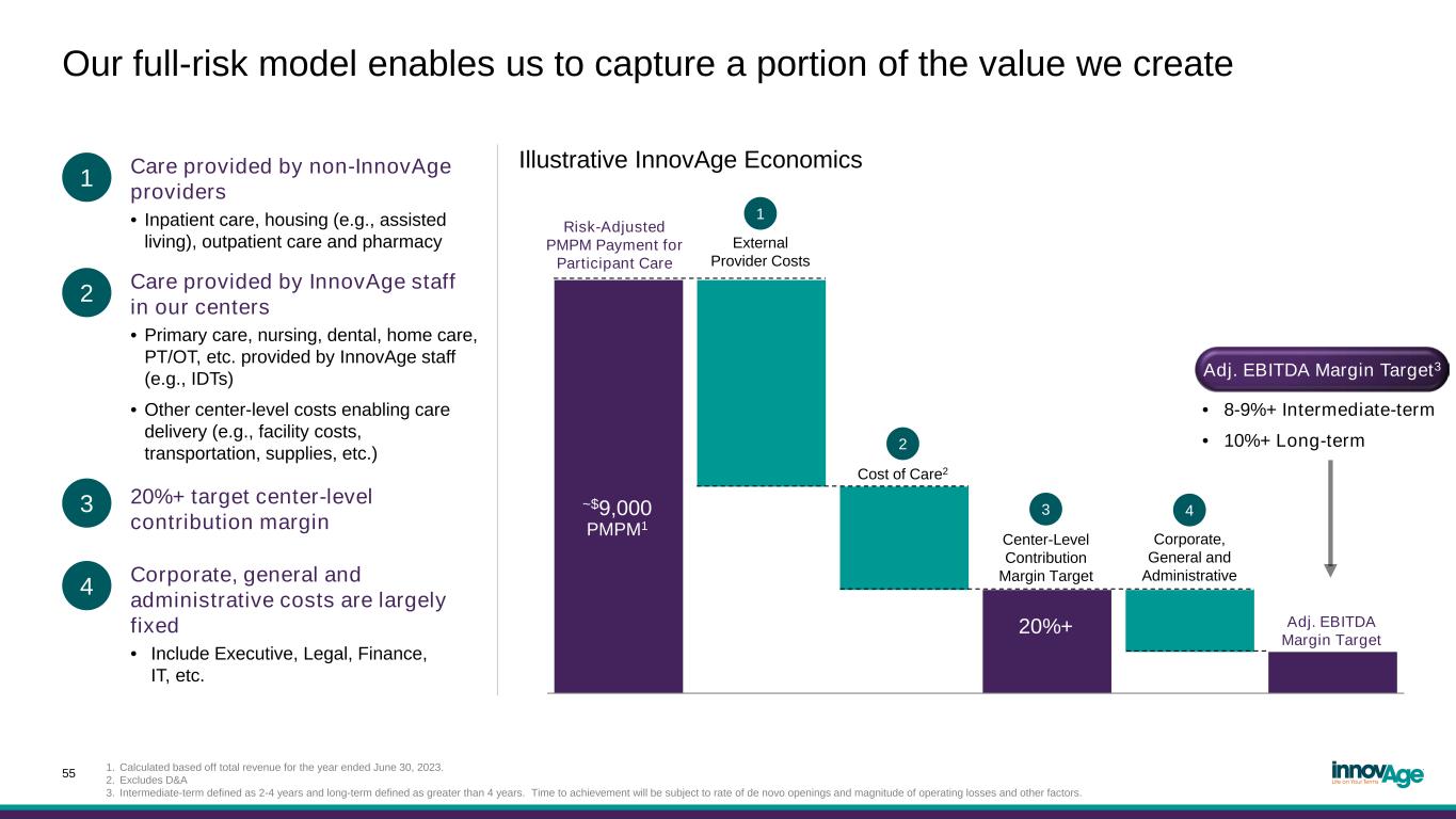 Our full-risk model enables us to capture a portion of the value we create 1. Calculated based off total revenue for the year ended June 30, 2023. 2. Excludes D&A 3. Intermediate-term defined as 2-4 years and long-term defined as greater than 4 years. Time to achievement will be subject to rate of de novo openings and magnitude of operating losses and other factors. 55 Illustrative InnovAge Economics External Provider Costs Center-Level Contribution Margin Target Cost of Care2 Corporate, General and Administrative Adj. EBITDA Margin Target 1 2 3~$9,000 PMPM1 Risk-Adjusted PMPM Payment for Participant Care 1 2 3 Care provided by non-InnovAge providers • Inpatient care, housing (e.g., assisted living), outpatient care and pharmacy Care provided by InnovAge staff in our centers • Primary care, nursing, dental, home care, PT/OT, etc. provided by InnovAge staff (e.g., IDTs) • Other center-level costs enabling care delivery (e.g., facility costs, transportation, supplies, etc.) 20%+ target center-level contribution margin 4 Corporate, general and administrative costs are largely fixed • Include Executive, Legal, Finance, IT, etc. 4 20%+ • 8-9%+ Intermediate-term • 10%+ Long-term Adj. EBITDA Margin Target3