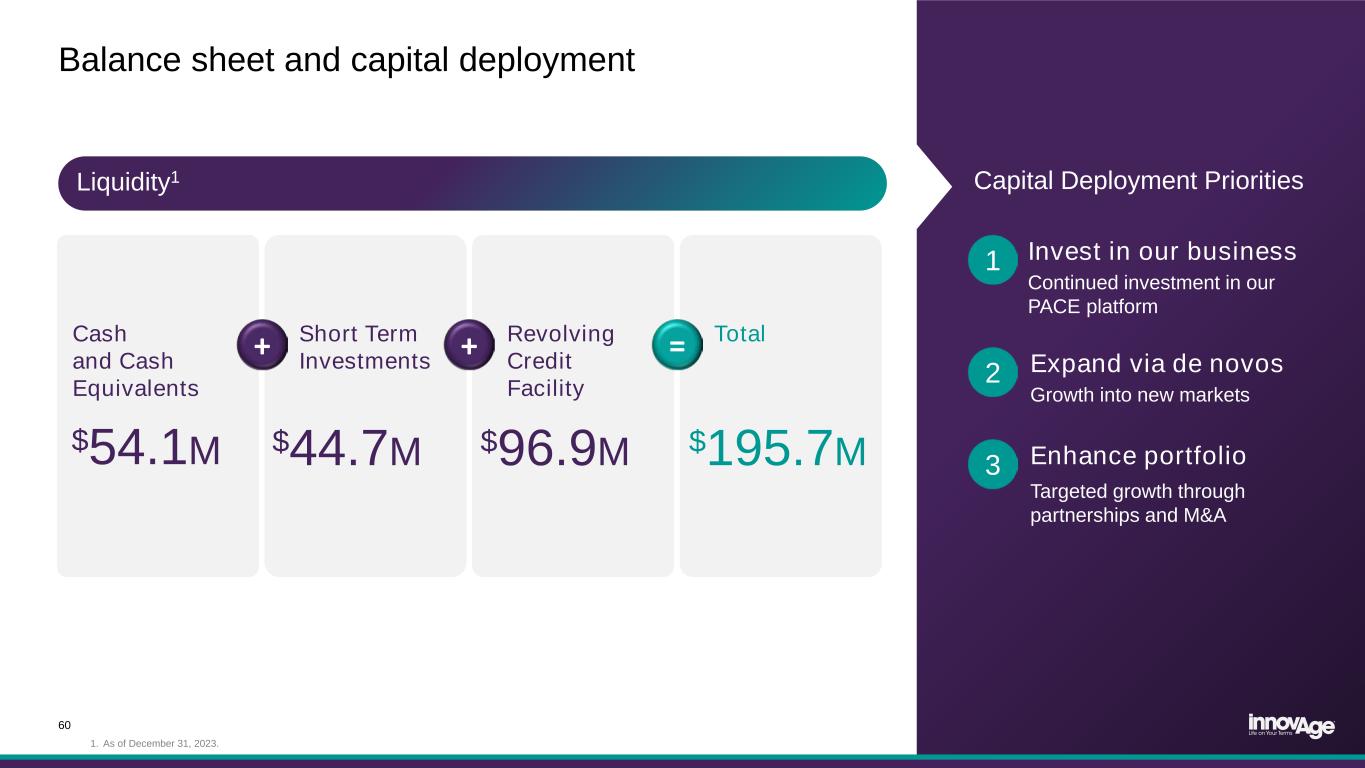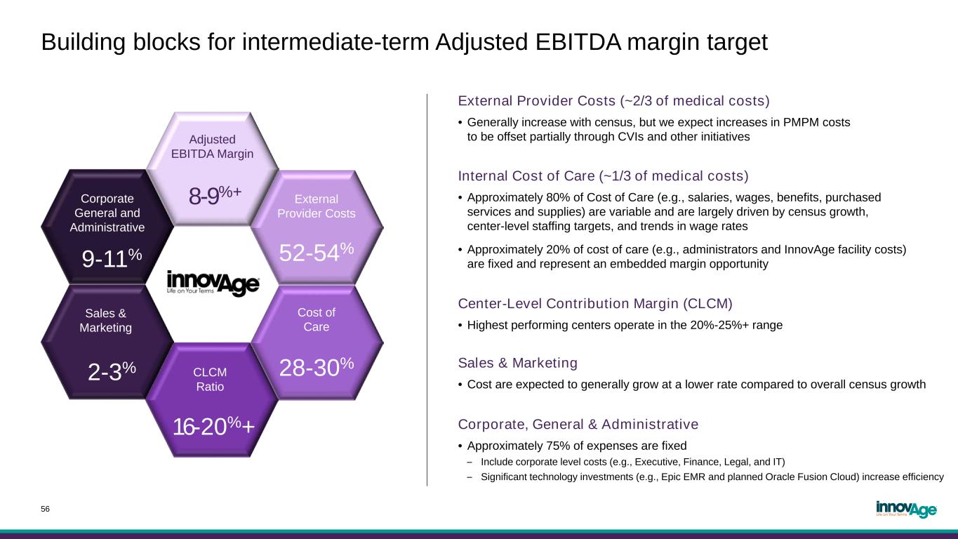 Building blocks for intermediate-term Adjusted EBITDA margin target 56 External Provider Costs (~2/3 of medical costs) • Generally increase with census, but we expect increases in PMPM costs to be offset partially through CVIs and other initiatives Internal Cost of Care (~1/3 of medical costs) • Approximately 80% of Cost of Care (e.g., salaries, wages, benefits, purchased services and supplies) are variable and are largely driven by census growth, center-level staffing targets, and trends in wage rates • Approximately 20% of cost of care (e.g., administrators and InnovAge facility costs) are fixed and represent an embedded margin opportunity Center-Level Contribution Margin (CLCM) • Highest performing centers operate in the 20%-25%+ range Sales & Marketing • Cost are expected to generally grow at a lower rate compared to overall census growth Corporate, General & Administrative • Approximately 75% of expenses are fixed – Include corporate level costs (e.g., Executive, Finance, Legal, and IT) – Significant technology investments (e.g., Epic EMR and planned Oracle Fusion Cloud) increase efficiency Adjusted EBITDA Margin External Provider Costs 52-54% 8-9%+ CLCM Ratio 16-20%+ Corporate General and Administrative 9-11% Sales & Marketing 2-3% Cost of Care 28-30%