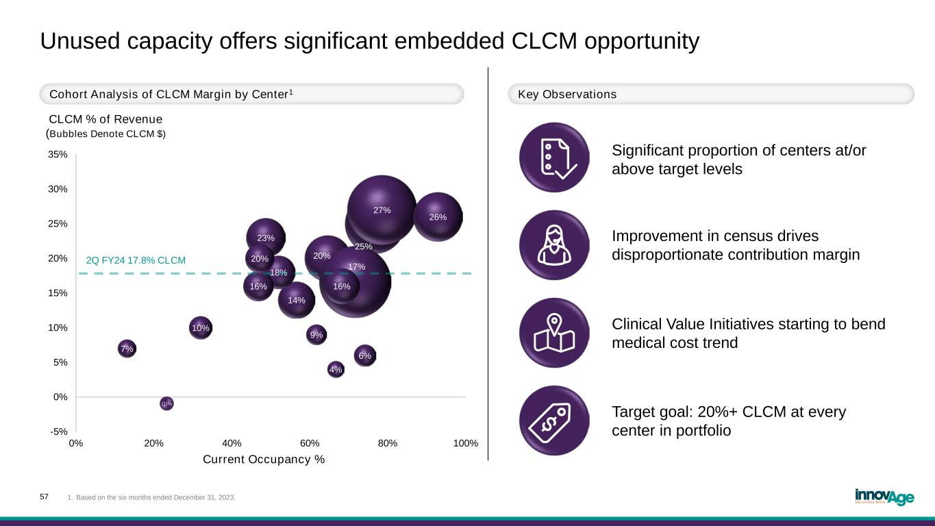 Significant proportion of centers at/or above target levels Improvement in census drives disproportionate contribution margin Clinical Value Initiatives starting to bend medical cost trend Target goal: 20%+ CLCM at every center in portfolio Unused capacity offers significant embedded CLCM opportunity 57 1. Based on the six months ended December 31, 2023. Cohort Analysis of CLCM Margin by Center1 Key Observations 20% 25% 14% 27% 4% 26% 6% 17% 7% 23% 16% 18% 16% 20% 9% 10% -5% 0% 5% 10% 15% 20% 25% 30% 35% 0% 20% 40% 60% 80% 100% (1)% 2Q FY24 17.8% CLCM CLCM % of Revenue (Bubbles Denote CLCM $) Current Occupancy %