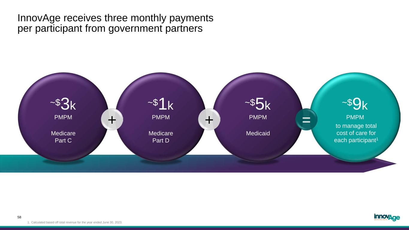 InnovAge receives three monthly payments per participant from government partners 1. Calculated based off total revenue for the year ended June 30, 2023. 58 + + = ~$3k PMPM ~$1k PMPM ~$5k PMPM ~$9k PMPM Medicare Part C Medicare Part D Medicaid to manage total cost of care for each participant1