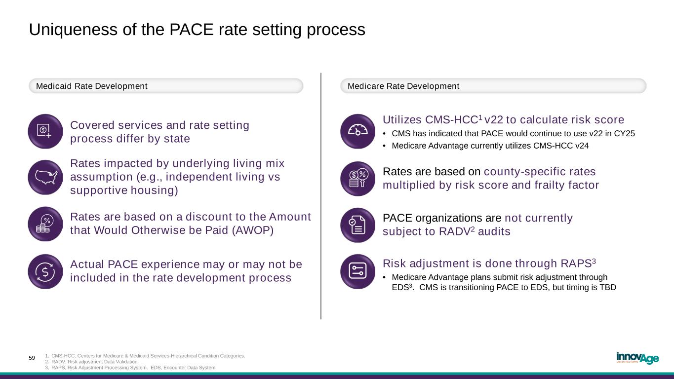 Uniqueness of the PACE rate setting process 59 Medicare Rate DevelopmentMedicaid Rate Development Covered services and rate setting process differ by state Rates are based on a discount to the Amount that Would Otherwise be Paid (AWOP) Actual PACE experience may or may not be included in the rate development process Utilizes CMS-HCC1 v22 to calculate risk score • CMS has indicated that PACE would continue to use v22 in CY25 • Medicare Advantage currently utilizes CMS-HCC v24 Rates are based on county-specific rates multiplied by risk score and frailty factor PACE organizations are not currently subject to RADV2 audits Risk adjustment is done through RAPS3 • Medicare Advantage plans submit risk adjustment through EDS3. CMS is transitioning PACE to EDS, but timing is TBD 1. CMS-HCC, Centers for Medicare & Medicaid Services-Hierarchical Condition Categories. 2. RADV, Risk adjustment Data Validation. 3. RAPS, Risk Adjustment Processing System. EDS, Encounter Data System Rates impacted by underlying living mix assumption (e.g., independent living vs supportive housing)