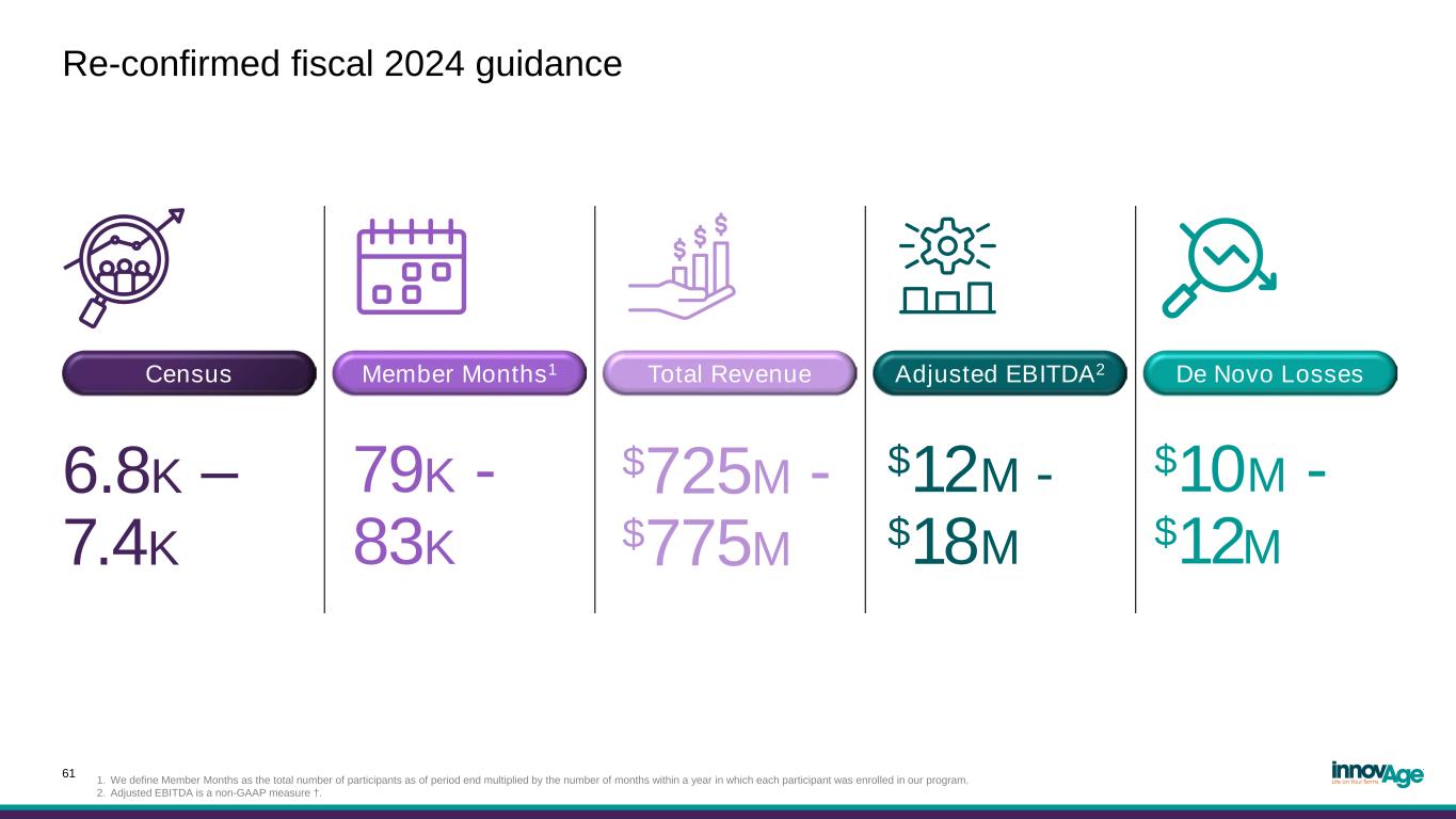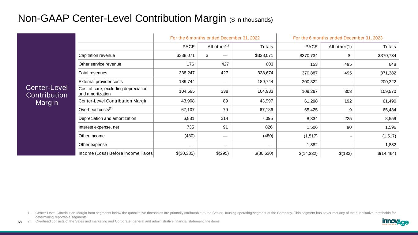 Non-GAAP Center-Level Contribution Margin ($ in thousands) 1. Center-Level Contribution Margin from segments below the quantitative thresholds are primarily attributable to the Senior Housing operating segment of the Company. This segment has never met any of the quantitative thresholds for determining reportable segments. 2. Overhead consists of the Sales and marketing and Corporate, general and administrative financial statement line items. Center-Level Contribution Margin For the 6 months ended December 31, 2022 For the 6 months ended December 31, 2023 PACE All other(1) Totals PACE All other(1) Totals Capitation revenue $338,071 $ — $338,071 $370,734 $- $370,734 Other service revenue 176 427 603 153 495 648 Total revenues 338,247 427 338,674 370,887 495 371,382 External provider costs 189,744 — 189,744 200,322 - 200,322 Cost of care, excluding depreciation and amortization 104,595 338 104,933 109,267 303 109,570 Center-Level Contribution Margin 43,908 89 43,997 61,298 192 61,490 Overhead costs(2) 67,107 79 67,186 65,425 9 65,434 Depreciation and amortization 6,881 214 7,095 8,334 225 8,559 Interest expense, net 735 91 826 1,506 90 1,596 Other income (480) — (480) (1,517) - (1,517) Other expense — — — 1,882 - 1,882 Income (Loss) Before Income Taxes $(30,335) $(295) $(30,630) $(14,332) $(132) $(14,464) 68