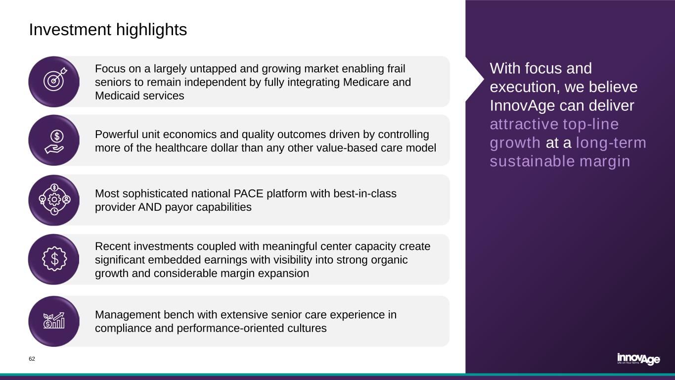 Investment highlights With focus and execution, we believe InnovAge can deliver attractive top-line growth at a long-term sustainable margin Focus on a largely untapped and growing market enabling frail seniors to remain independent by fully integrating Medicare and Medicaid services Powerful unit economics and quality outcomes driven by controlling more of the healthcare dollar than any other value-based care model Most sophisticated national PACE platform with best-in-class provider AND payor capabilities Management bench with extensive senior care experience in compliance and performance-oriented cultures 62 Recent investments coupled with meaningful center capacity create significant embedded earnings with visibility into strong organic growth and considerable margin expansion
