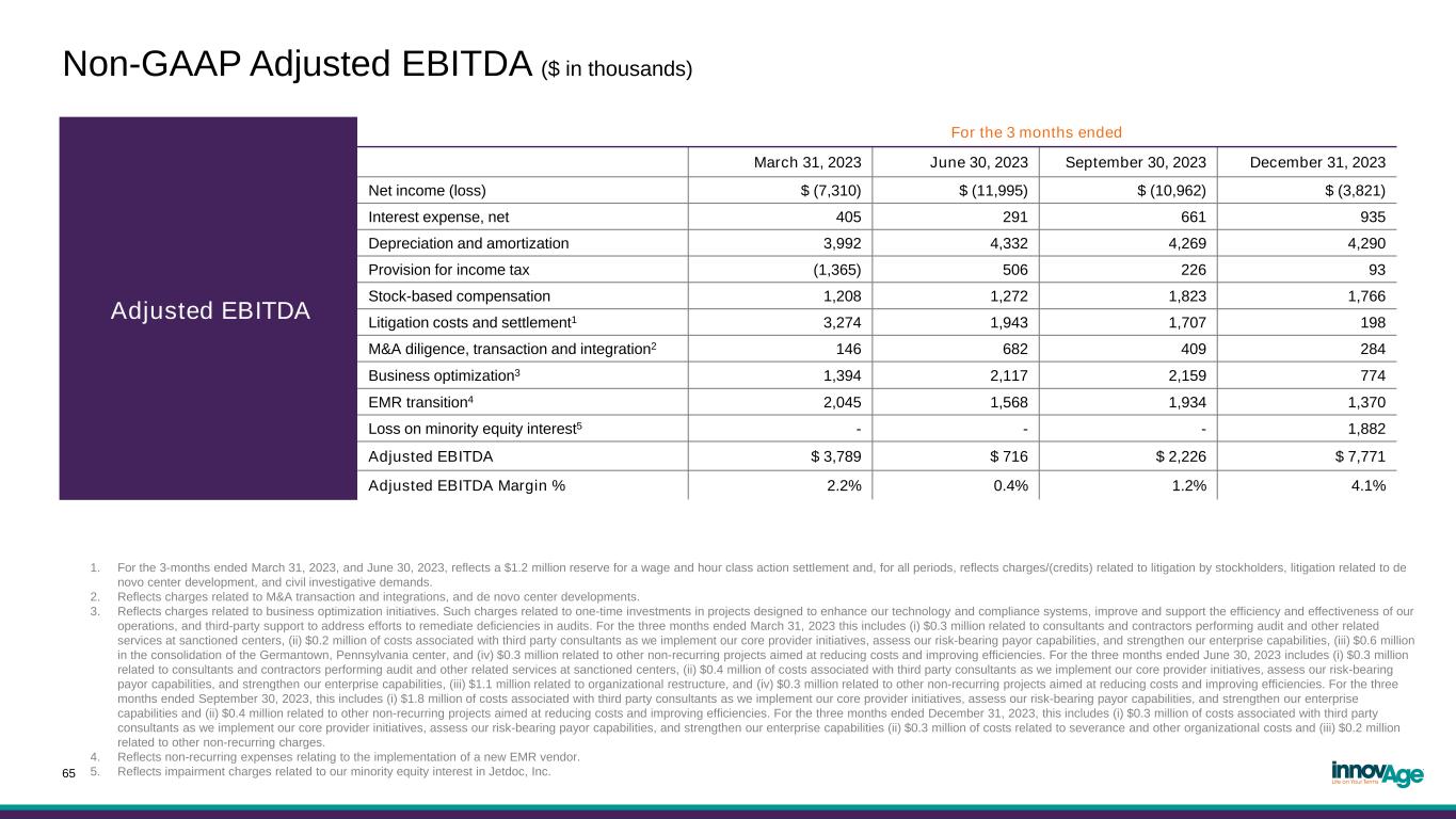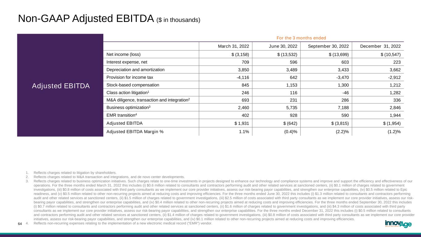Non-GAAP Adjusted EBITDA ($ in thousands) 1. Reflects charges related to litigation by shareholders. 2. Reflects charges related to M&A transaction and integrations, and de novo center developments. 3. Reflects charges related to business optimization initiatives. Such charges relate to one-time investments in projects designed to enhance our technology and compliance systems and improve and support the efficiency and effectiveness of our operations. For the three months ended March 31, 2022 this includes (i) $0.6 million related to consultants and contractors performing audit and other related services at sanctioned centers, (ii) $0.1 million of charges related to government investigations, (iii) $0.8 million of costs associated with third party consultants as we implement our core provider initiatives, assess our risk-bearing payor capabilities, and strengthen our enterprise capabilities, (iv) $0.5 million related to Epic readiness, and (v) $0.5 million related to other non-recurring projects aimed at reducing costs and improving efficiencies. For the three months ended June 30, 2022 this includes (i) $1.3 million related to consultants and contractors performing audit and other related services at sanctioned centers, (ii) $1.5 million of charges related to government investigations, (iii) $2.5 million of costs associated with third party consultants as we implement our core provider initiatives, assess our risk- bearing payor capabilities, and strengthen our enterprise capabilities, and (iv) $0.4 million related to other non-recurring projects aimed at reducing costs and improving efficiencies. For the three months ended September 30, 2022 this includes (i) $0.7 million related to consultants and contractors performing audit and other related services at sanctioned centers, (ii) $1.6 million of charges related to government investigations, and (iii) $4.3 million of costs associated with third party consultants as we implement our core provider initiatives, assess our risk-bearing payor capabilities, and strengthen our enterprise capabilities. For the three months ended December 31, 2022 this includes (i) $0.5 million related to consultants and contractors performing audit and other related services at sanctioned centers, (ii) $1.4 million of charges related to government investigations, (iii) $0.8 million of costs associated with third party consultants as we implement our core provider initiatives, assess our risk-bearing payor capabilities, and strengthen our enterprise capabilities, and (iv) $0.1 million related to other non-recurring projects aimed at reducing costs and improving efficiencies. 4. Reflects non-recurring expenses relating to the implementation of a new electronic medical record (“EMR”) vendor. Adjusted EBITDA For the 3 months ended March 31, 2022 June 30, 2022 September 30, 2022 December 31, 2022 Net income (loss) $ (3,158) $ (13,532) $ (13,699) $ (10,547) Interest expense, net 709 596 603 223 Depreciation and amortization 3,850 3,489 3,433 3,662 Provision for income tax -4,116 642 -3,470 -2,912 Stock-based compensation 845 1,153 1,300 1,212 Class action litigation1 246 116 -46 1,282 M&A diligence, transaction and integration2 693 231 286 336 Business optimization3 2,460 5,735 7,188 2,846 EMR transition4 402 928 590 1,944 Adjusted EBITDA $ 1,931 $ (642) $ (3,815) $ (1,954) Adjusted EBITDA Margin % 1.1% (0.4)% (2.2)% (1.2)% 64