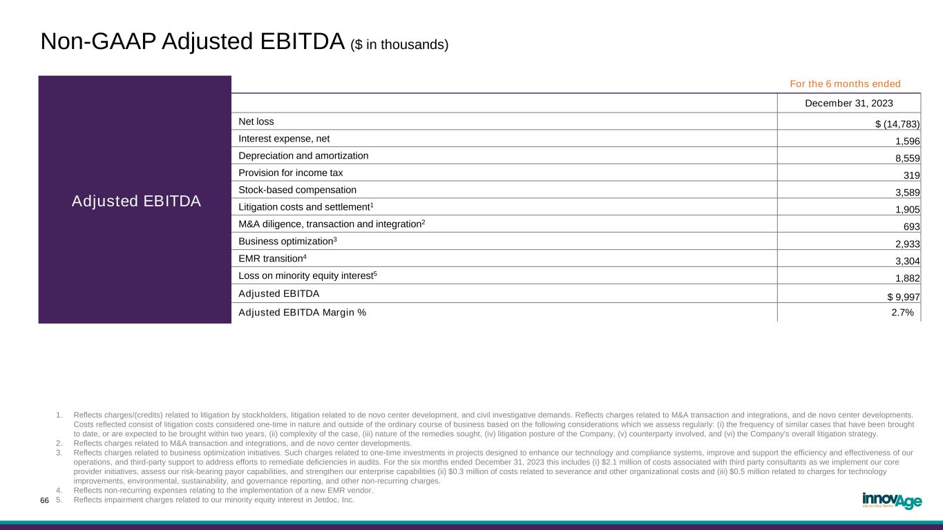 Non-GAAP Adjusted EBITDA ($ in thousands) 1. For the 3-months ended March 31, 2023, and June 30, 2023, reflects a $1.2 million reserve for a wage and hour class action settlement and, for all periods, reflects charges/(credits) related to litigation by stockholders, litigation related to de novo center development, and civil investigative demands. 2. Reflects charges related to M&A transaction and integrations, and de novo center developments. 3. Reflects charges related to business optimization initiatives. Such charges related to one-time investments in projects designed to enhance our technology and compliance systems, improve and support the efficiency and effectiveness of our operations, and third-party support to address efforts to remediate deficiencies in audits. For the three months ended March 31, 2023 this includes (i) $0.3 million related to consultants and contractors performing audit and other related services at sanctioned centers, (ii) $0.2 million of costs associated with third party consultants as we implement our core provider initiatives, assess our risk-bearing payor capabilities, and strengthen our enterprise capabilities, (iii) $0.6 million in the consolidation of the Germantown, Pennsylvania center, and (iv) $0.3 million related to other non-recurring projects aimed at reducing costs and improving efficiencies. For the three months ended June 30, 2023 includes (i) $0.3 million related to consultants and contractors performing audit and other related services at sanctioned centers, (ii) $0.4 million of costs associated with third party consultants as we implement our core provider initiatives, assess our risk-bearing payor capabilities, and strengthen our enterprise capabilities, (iii) $1.1 million related to organizational restructure, and (iv) $0.3 million related to other non-recurring projects aimed at reducing costs and improving efficiencies. For the three months ended September 30, 2023, this includes (i) $1.8 million of costs associated with third party consultants as we implement our core provider initiatives, assess our risk-bearing payor capabilities, and strengthen our enterprise capabilities and (ii) $0.4 million related to other non-recurring projects aimed at reducing costs and improving efficiencies. For the three months ended December 31, 2023, this includes (i) $0.3 million of costs associated with third party consultants as we implement our core provider initiatives, assess our risk-bearing payor capabilities, and strengthen our enterprise capabilities (ii) $0.3 million of costs related to severance and other organizational costs and (iii) $0.2 million related to other non-recurring charges. 4. Reflects non-recurring expenses relating to the implementation of a new EMR vendor. 5. Reflects impairment charges related to our minority equity interest in Jetdoc, Inc. For the 3 months ended March 31, 2023 June 30, 2023 September 30, 2023 December 31, 2023 Net income (loss) $ (7,310) $ (11,995) $ (10,962) $ (3,821) Interest expense, net 405 291 661 935 Depreciation and amortization 3,992 4,332 4,269 4,290 Provision for income tax (1,365) 506 226 93 Stock-based compensation 1,208 1,272 1,823 1,766 Litigation costs and settlement1 3,274 1,943 1,707 198 M&A diligence, transaction and integration2 146 682 409 284 Business optimization3 1,394 2,117 2,159 774 EMR transition4 2,045 1,568 1,934 1,370 Loss on minority equity interest5 - - - 1,882 Adjusted EBITDA $ 3,789 $ 716 $ 2,226 $ 7,771 Adjusted EBITDA Margin % 2.2% 0.4% 1.2% 4.1% 65 Adjusted EBITDA