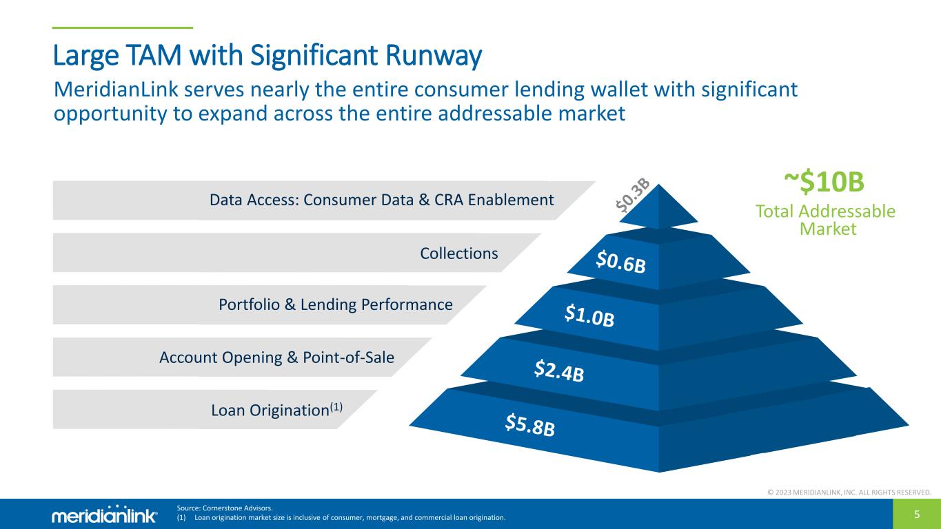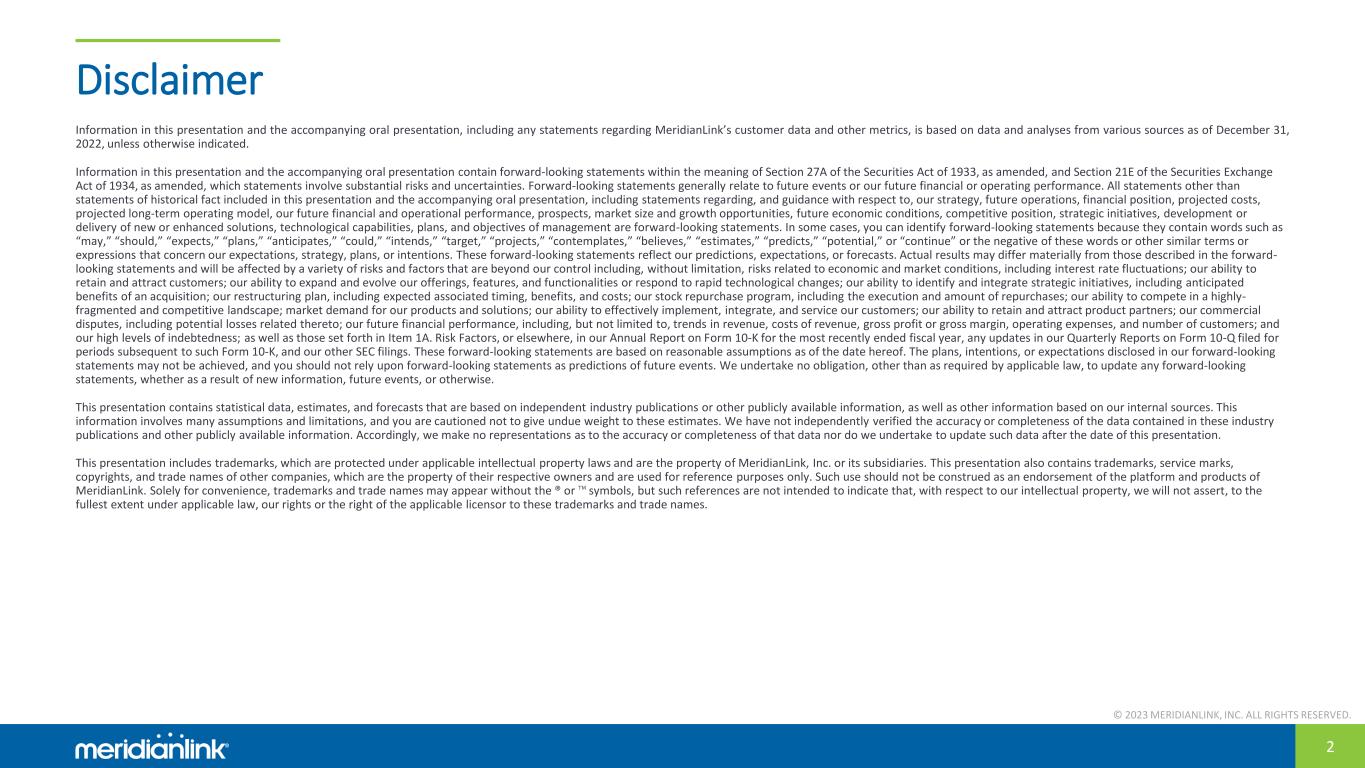 © 2023 MERIDIANLINK, INC. ALL RIGHTS RESERVED. 2 Disclaimer Information in this presentation and the accompanying oral presentation, including any statements regarding MeridianLink’s customer data and other metrics, is based on data and analyses from various sources as of December 31, 2022, unless otherwise indicated. Information in this presentation and the accompanying oral presentation contain forward-looking statements within the meaning of Section 27A of the Securities Act of 1933, as amended, and Section 21E of the Securities Exchange Act of 1934, as amended, which statements involve substantial risks and uncertainties. Forward-looking statements generally relate to future events or our future financial or operating performance. All statements other than statements of historical fact included in this presentation and the accompanying oral presentation, including statements regarding, and guidance with respect to, our strategy, future operations, financial position, projected costs, projected long-term operating model, our future financial and operational performance, prospects, market size and growth opportunities, future economic conditions, competitive position, strategic initiatives, development or delivery of new or enhanced solutions, technological capabilities, plans, and objectives of management are forward-looking statements. In some cases, you can identify forward-looking statements because they contain words such as “may,” “should,” “expects,” “plans,” “anticipates,” “could,” “intends,” “target,” “projects,” “contemplates,” “believes,” “estimates,” “predicts,” “potential,” or “continue” or the negative of these words or other similar terms or expressions that concern our expectations, strategy, plans, or intentions. These forward-looking statements reflect our predictions, expectations, or forecasts. Actual results may differ materially from those described in the forward- looking statements and will be affected by a variety of risks and factors that are beyond our control including, without limitation, risks related to economic and market conditions, including interest rate fluctuations; our ability to retain and attract customers; our ability to expand and evolve our offerings, features, and functionalities or respond to rapid technological changes; our ability to identify and integrate strategic initiatives, including anticipated benefits of an acquisition; our restructuring plan, including expected associated timing, benefits, and costs; our stock repurchase program, including the execution and amount of repurchases; our ability to compete in a highly- fragmented and competitive landscape; market demand for our products and solutions; our ability to effectively implement, integrate, and service our customers; our ability to retain and attract product partners; our commercial disputes, including potential losses related thereto; our future financial performance, including, but not limited to, trends in revenue, costs of revenue, gross profit or gross margin, operating expenses, and number of customers; and our high levels of indebtedness; as well as those set forth in Item 1A. Risk Factors, or elsewhere, in our Annual Report on Form 10-K for the most recently ended fiscal year, any updates in our Quarterly Reports on Form 10-Q filed for periods subsequent to such Form 10-K, and our other SEC filings. These forward-looking statements are based on reasonable assumptions as of the date hereof. The plans, intentions, or expectations disclosed in our forward-looking statements may not be achieved, and you should not rely upon forward-looking statements as predictions of future events. We undertake no obligation, other than as required by applicable law, to update any forward-looking statements, whether as a result of new information, future events, or otherwise.​ This presentation contains statistical data, estimates, and forecasts that are based on independent industry publications or other publicly available information, as well as other information based on our internal sources. This information involves many assumptions and limitations, and you are cautioned not to give undue weight to these estimates. We have not independently verified the accuracy or completeness of the data contained in these industry publications and other publicly available information. Accordingly, we make no representations as to the accuracy or completeness of that data nor do we undertake to update such data after the date of this presentation. This presentation includes trademarks, which are protected under applicable intellectual property laws and are the property of MeridianLink, Inc. or its subsidiaries. This presentation also contains trademarks, service marks, copyrights, and trade names of other companies, which are the property of their respective owners and are used for reference purposes only. Such use should not be construed as an endorsement of the platform and products of MeridianLink. Solely for convenience, trademarks and trade names may appear without the ® or ™ symbols, but such references are not intended to indicate that, with respect to our intellectual property, we will not assert, to the fullest extent under applicable law, our rights or the right of the applicable licensor to these trademarks and trade names.