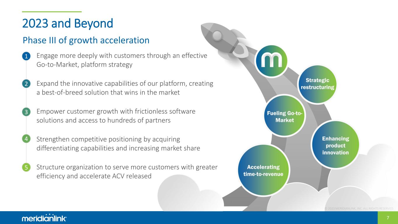 © 2023 MERIDIANLINK, INC. ALL RIGHTS RESERVED. 6 Targeting New Logos and Expanding the Sweet Spot for Sales Big Game Hunters Multi-Pronged Direct Sales Focused on Market Segments Up-MarketDown-Market Sweet Spot <$100M AUM $1B - $10B AUM 3,800+ FIs $10B+ AUM 165+ FIs1,200+ FIs $100M - $1B AUM 4,300+ FIs Inside Sales Focused sales strategies to strategically grow FI base up and down market