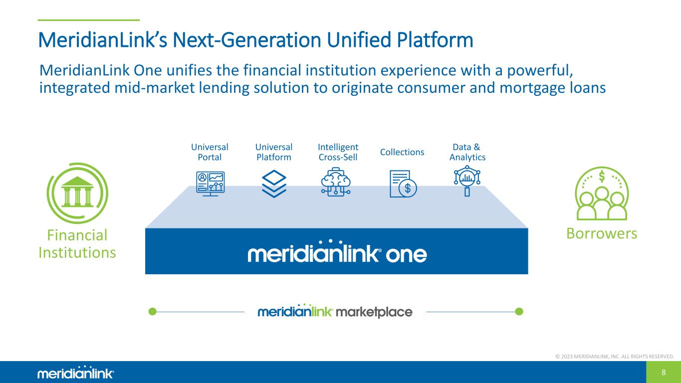 © 2023 MERIDIANLINK, INC. ALL RIGHTS RESERVED. 7 Strategic restructuring Fueling Go-to- Market Enhancing product innovation Accelerating time-to-revenue • Engage more deeply with customers through an effective Go-to-Market, platform strategy • Expand the innovative capabilities of our platform, creating a best-of-breed solution that wins in the market • Empower customer growth with frictionless software solutions and access to hundreds of partners • Strengthen competitive positioning by acquiring differentiating capabilities and increasing market share • Structure organization to serve more customers with greater efficiency and accelerate ACV released 2023 and Beyond 1 2 4 3 5 Phase III of growth acceleration
