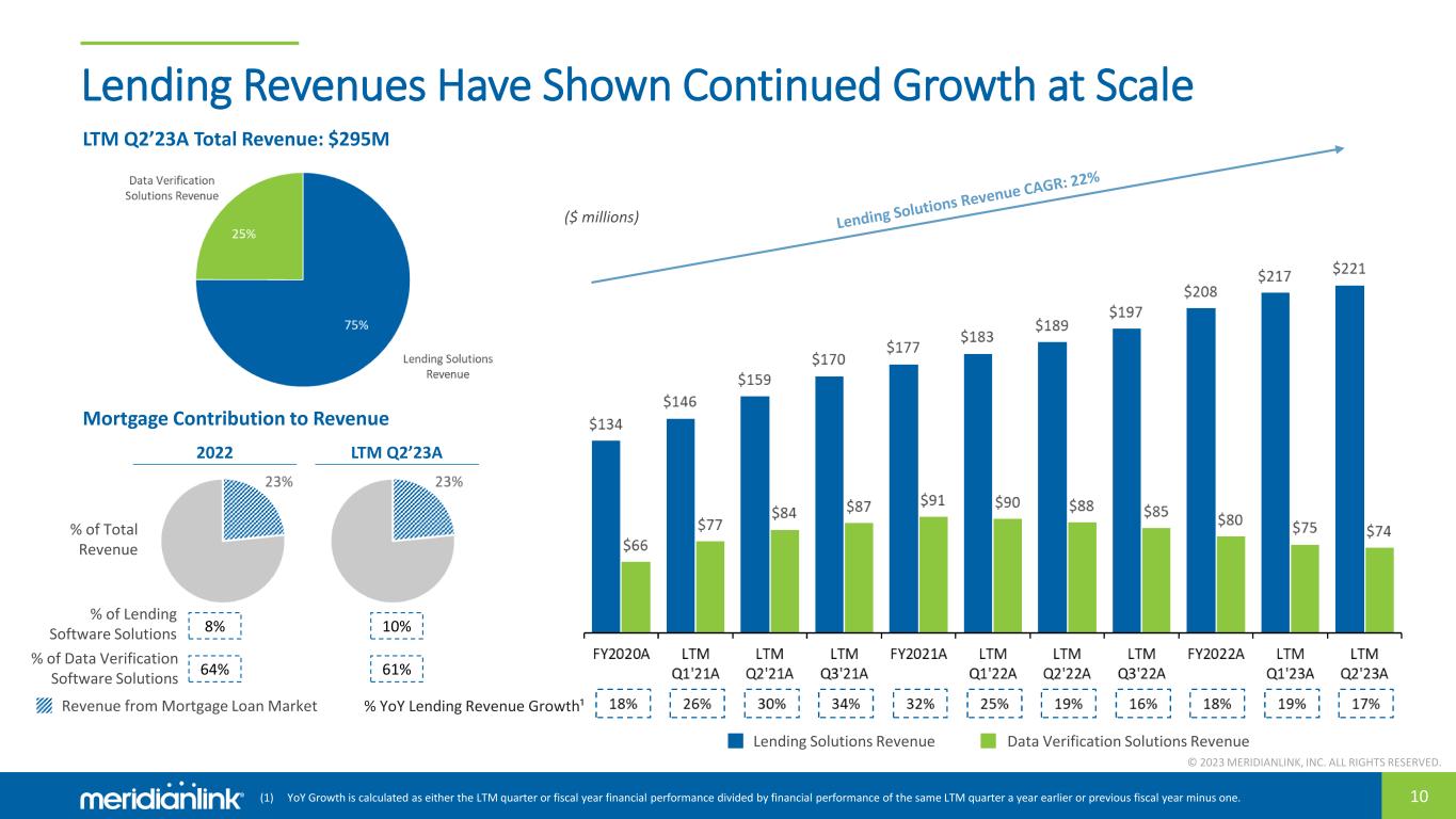 © 2023 MERIDIANLINK, INC. ALL RIGHTS RESERVED. 9 Multi-Vector Growth Strategy Expand Product Offerings Enhance Partner Marketplace Monetization Add New Logos Capitalize on Organic Volume Growth Robust Pipeline of M&A Opportunities Multiple actionable initiatives to accelerate growth Pursue Unrealized Upsell & Cross-Sell Key Customer Themes Underpinning Growth Paper-to-Digital Transition in Target Market Competition Among Financial Institutions