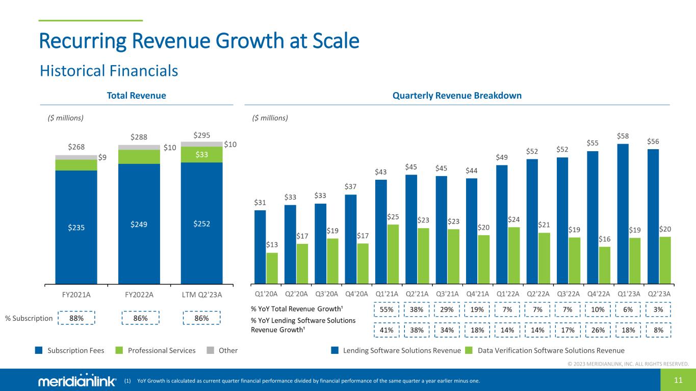 © 2023 MERIDIANLINK, INC. ALL RIGHTS RESERVED. 10 Lending Revenues Have Shown Continued Growth at Scale Lending Solutions Revenue Data Verification Solutions Revenue LTM Q2’23A Total Revenue: $295M % YoY Lending Revenue Growth¹Revenue from Mortgage Loan Market % of Total Revenue % of Lending Software Solutions % of Data Verification Software Solutions 2022 LTM Q2’23A 8% 64% 10% 61% Mortgage Contribution to Revenue ($ millions) (1) YoY Growth is calculated as either the LTM quarter or fiscal year financial performance divided by financial performance of the same LTM quarter a year earlier or previous fiscal year minus one.