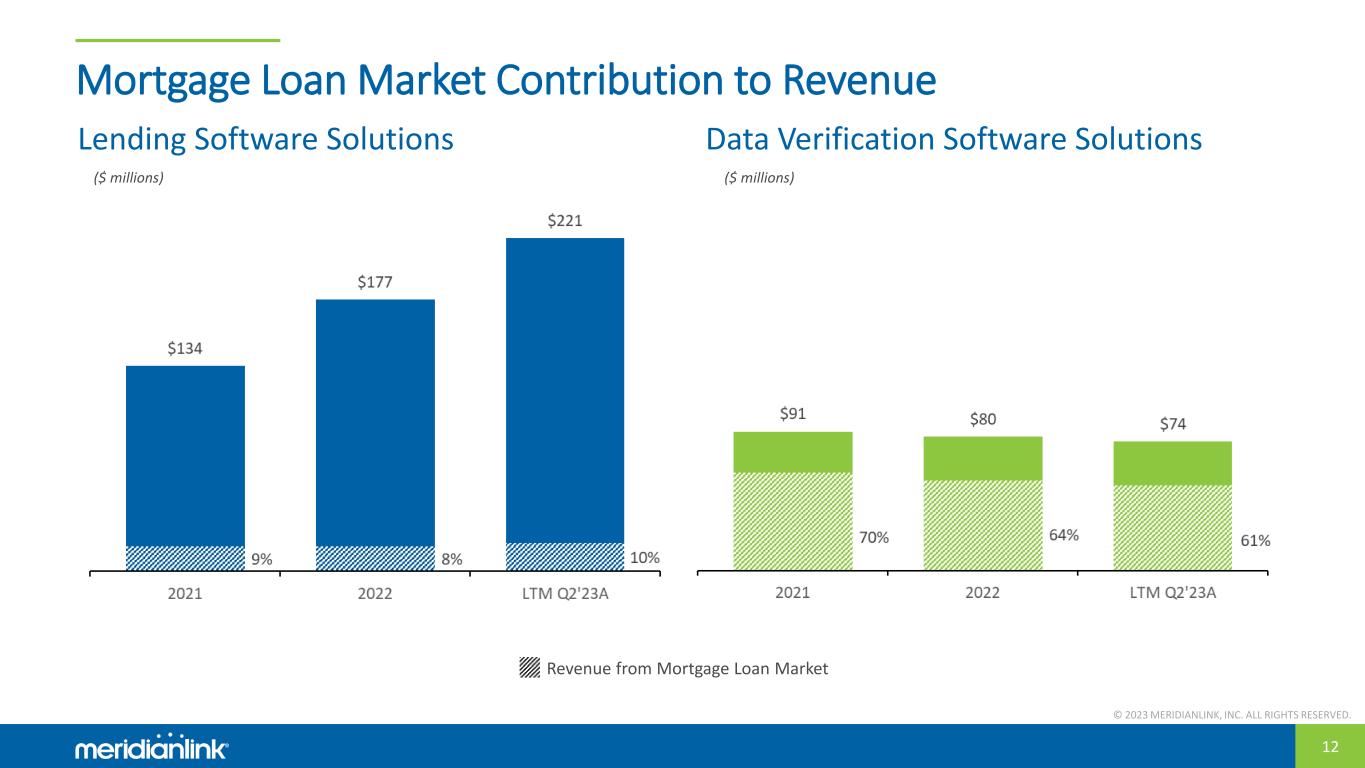 © 2023 MERIDIANLINK, INC. ALL RIGHTS RESERVED. 11 Recurring Revenue Growth at Scale Total Revenue Quarterly Revenue Breakdown ($ millions) ($ millions) % Subscription Professional Services OtherSubscription Fees Lending Software Solutions Revenue Data Verification Software Solutions Revenue Historical Financials (1) YoY Growth is calculated as current quarter financial performance divided by financial performance of the same quarter a year earlier minus one.