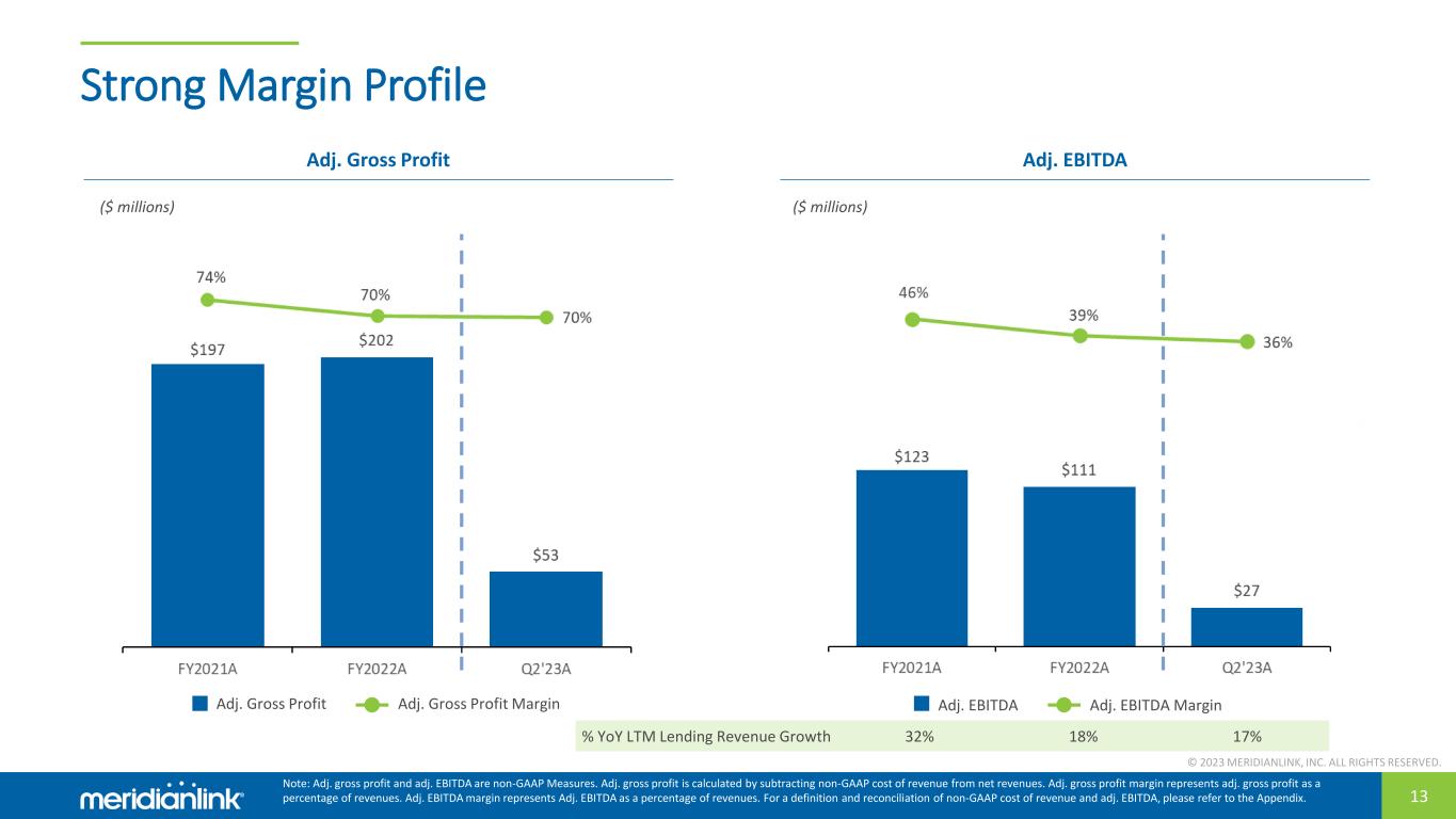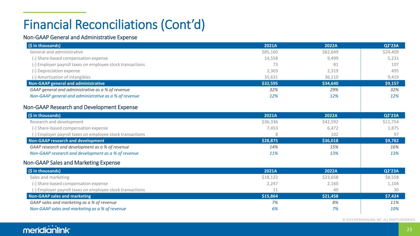 © 2023 MERIDIANLINK, INC. ALL RIGHTS RESERVED. 22 Financial Reconciliations (Cont’d) ($ in thousands) 2021A 2022A Q2’23A Revenues, net $267,676 $288,046 $75,415 Cost of revenue 89,622 106,331 28,494 (-) Share-based compensation expense 6,478 4,630 1,157 (-) Employer payroll taxes on employee stock transactions 3 127 88 (-) Amortization of developed technology 12,519 15,553 4,510 Non-GAAP cost of revenue 70,622 86,021 22,739 Adjusted gross profit $197,054 $202,025 $52,676 GAAP gross margin 67% 63% 62% Adjusted gross margin 74% 70% 70% Adjusted Gross Profit ($ in thousands) 2021A 2022A Q2’23A Net (loss) income ($9,996) $1,294 ($5,230) (+) Share-based compensation expense 30,736 22,761 9,367 (+) Employer payroll taxes on employee stock transactions 95 350 322 (+) Restructuring related costs – – – (+) Sponsor and third-party acquisition related costs 2,348 4,228 717 (+) Income tax effect on non-GAAP items (7,963) (6,561) (2,497) Non-GAAP net (loss) income $15,220 $22,072 $2,679 Non-GAAP basic net (loss) income per share $0.24 $0.27 $0.03 Non-GAAP diluted net (loss) income per share 0.23 0.27 0.03 Weighted average shares used to compute Non-GAAP basic net income per share 63,813,770 80,454,356 80,911,113 Weighted average shares used to compute Non-GAAP diluted net income per share 67,130,479 82,403,679 83,487,132 GAAP net income margin (4)% 0% (7)% Non-GAAP net income margin 6% 8% 4% Non-GAAP Net Income Note: Adj. gross profit is a non-GAAP Measure. Adj. gross profit is calculated by subtracting non-GAAP cost of revenue from net revenues. Adj. gross profit margin represents adj. gross profit as a percentage of revenues.