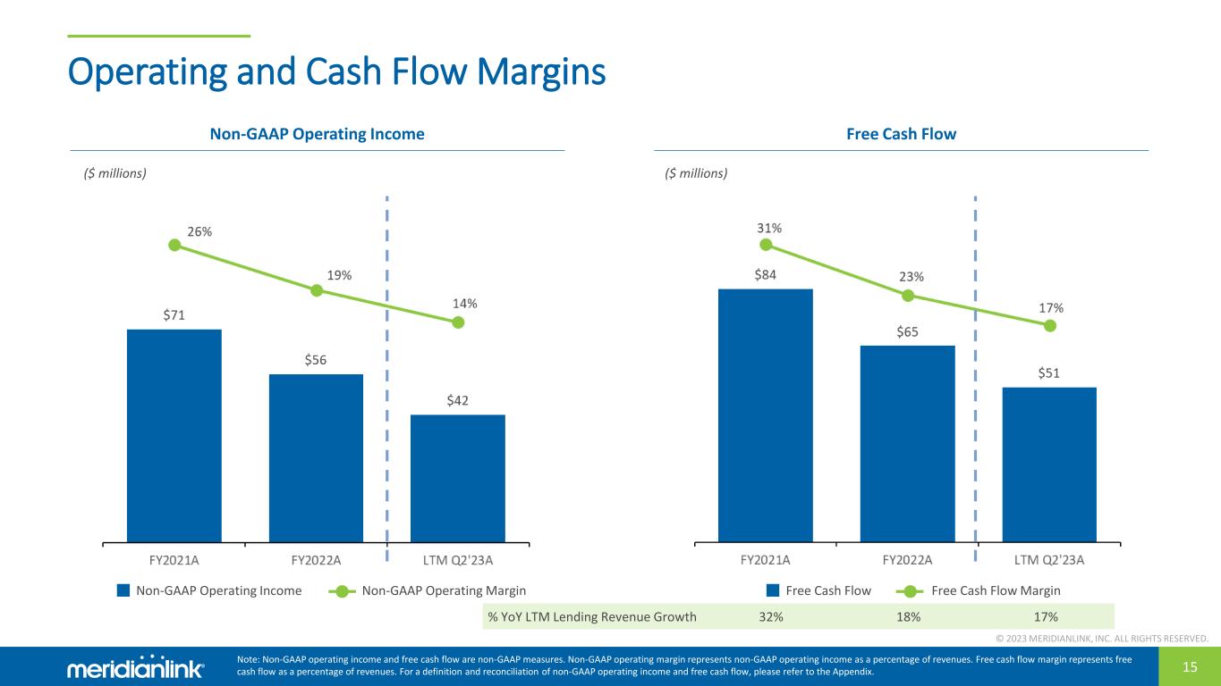 © 2023 MERIDIANLINK, INC. ALL RIGHTS RESERVED. 14 Capitalizing on Operating Leverage and Investing in Growth Adj. General & Administrative Adj. Research & Development Adj. Sales & Marketing ($ millions) ($ millions) ($ millions) S&M % of Revenue R&D % of Revenue G&A % of Revenue Note: Adj. Sales & Marketing, Adj. Research & Development, and Adj. General & Administrative expenses are non-GAAP measures. For a definition and reconciliation of non-GAAP operating expenses, please refer to the Appendix.