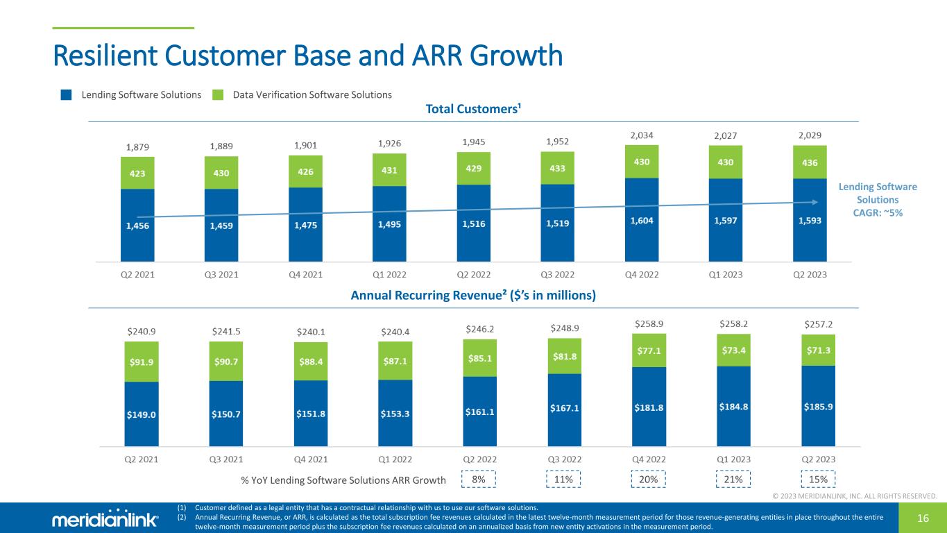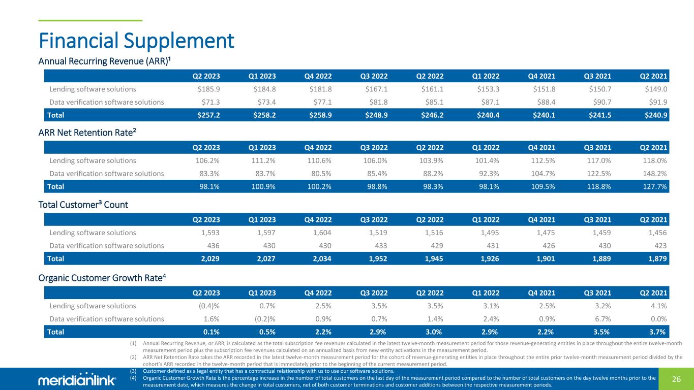 © 2023 MERIDIANLINK, INC. ALL RIGHTS RESERVED. 26 Financial Supplement Q2 2023 Q1 2023 Q4 2022 Q3 2022 Q2 2022 Q1 2022 Q4 2021 Q3 2021 Q2 2021 Lending software solutions $185.9 $184.8 $181.8 $167.1 $161.1 $153.3 $151.8 $150.7 $149.0 Data verification software solutions $71.3 $73.4 $77.1 $81.8 $85.1 $87.1 $88.4 $90.7 $91.9 Total $257.2 $258.2 $258.9 $248.9 $246.2 $240.4 $240.1 $241.5 $240.9 Annual Recurring Revenue (ARR)¹ Q2 2023 Q1 2023 Q4 2022 Q3 2022 Q2 2022 Q1 2022 Q4 2021 Q3 2021 Q2 2021 Lending software solutions 106.2% 111.2% 110.6% 106.0% 103.9% 101.4% 112.5% 117.0% 118.0% Data verification software solutions 83.3% 83.7% 80.5% 85.4% 88.2% 92.3% 104.7% 122.5% 148.2% Total 98.1% 100.9% 100.2% 98.8% 98.3% 98.1% 109.5% 118.8% 127.7% ARR Net Retention Rate² (1) Annual Recurring Revenue, or ARR, is calculated as the total subscription fee revenues calculated in the latest twelve-month measurement period for those revenue-generating entities in place throughout the entire twelve-month measurement period plus the subscription fee revenues calculated on an annualized basis from new entity activations in the measurement period. (2) ARR Net Retention Rate takes the ARR recorded in the latest twelve-month measurement period for the cohort of revenue-generating entities in place throughout the entire prior twelve-month measurement period divided by the cohort’s ARR recorded in the twelve-month period that is immediately prior to the beginning of the current measurement period. (3) Customer defined as a legal entity that has a contractual relationship with us to use our software solutions. (4) Organic Customer Growth Rate is the percentage increase in the number of total customers on the last day of the measurement period compared to the number of total customers on the day twelve months prior to the measurement date, which measures the change in total customers, net of both customer terminations and customer additions between the respective measurement periods. Organic Customer Growth Rate4 Q2 2023 Q1 2023 Q4 2022 Q3 2022 Q2 2022 Q1 2022 Q4 2021 Q3 2021 Q2 2021 Lending software solutions 1,593 1,597 1,604 1,519 1,516 1,495 1,475 1,459 1,456 Data verification software solutions 436 430 430 433 429 431 426 430 423 Total 2,029 2,027 2,034 1,952 1,945 1,926 1,901 1,889 1,879 Total Customer³ Count Q2 2023 Q1 2023 Q4 2022 Q3 2022 Q2 2022 Q1 2022 Q4 2021 Q3 2021 Q2 2021 Lending software solutions (0.4)% 0.7% 2.5% 3.5% 3.5% 3.1% 2.5% 3.2% 4.1% Data verification software solutions 1.6% (0.2)% 0.9% 0.7% 1.4% 2.4% 0.9% 6.7% 0.0% Total 0.1% 0.5% 2.2% 2.9% 3.0% 2.9% 2.2% 3.5% 3.7%