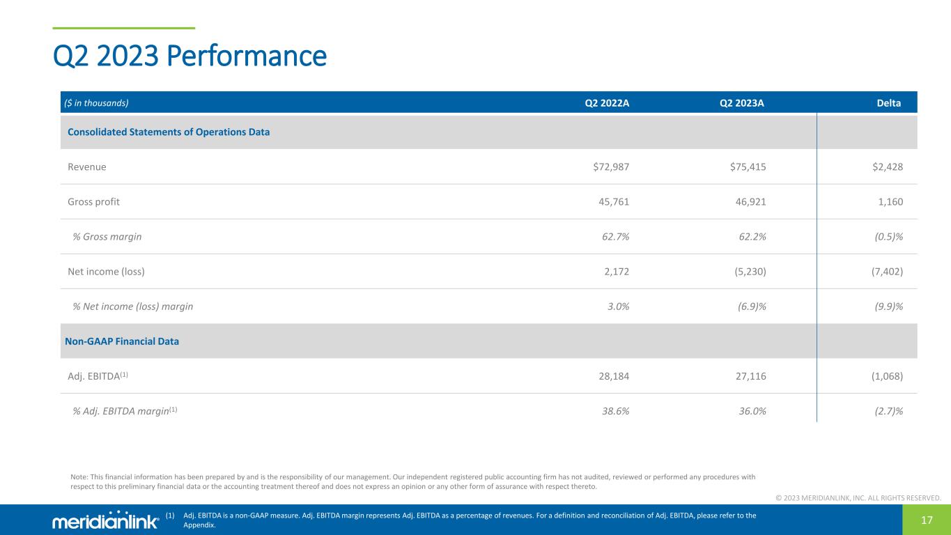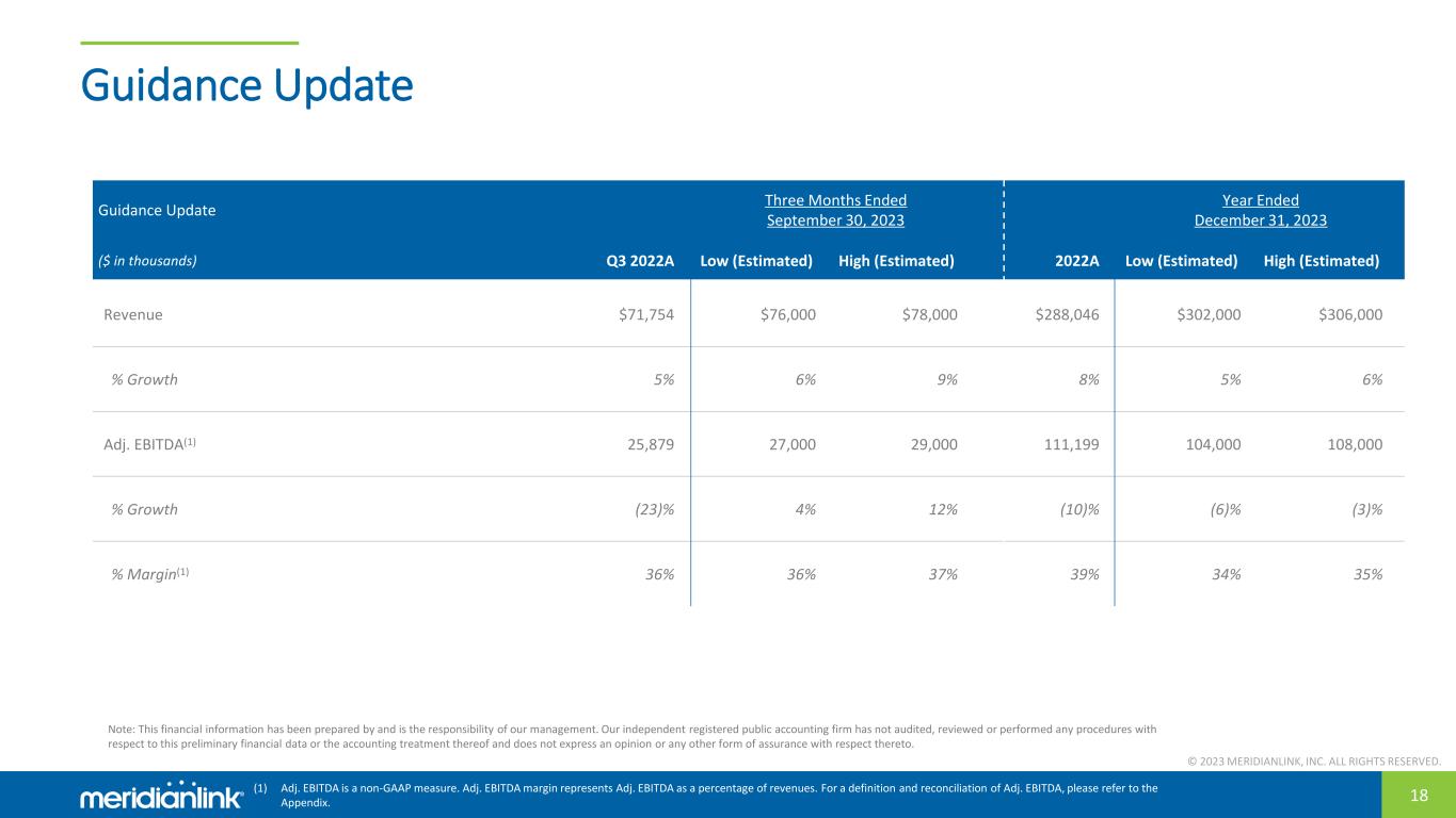 © 2023 MERIDIANLINK, INC. ALL RIGHTS RESERVED. 17 Q2 2023 Performance ($ in thousands) Q2 2022A Q2 2023A Delta Consolidated Statements of Operations Data Revenue $72,987 $75,415 $2,428 Gross profit 45,761 46,921 1,160 % Gross margin 62.7% 62.2% (0.5)% Net income (loss) 2,172 (5,230) (7,402) % Net income (loss) margin 3.0% (6.9)% (9.9)% Non-GAAP Financial Data Adj. EBITDA(1) 28,184 27,116 (1,068) % Adj. EBITDA margin(1) 38.6% 36.0% (2.7)% Note: This financial information has been prepared by and is the responsibility of our management. Our independent registered public accounting firm has not audited, reviewed or performed any procedures with respect to this preliminary financial data or the accounting treatment thereof and does not express an opinion or any other form of assurance with respect thereto. (1) Adj. EBITDA is a non-GAAP measure. Adj. EBITDA margin represents Adj. EBITDA as a percentage of revenues. For a definition and reconciliation of Adj. EBITDA, please refer to the Appendix.