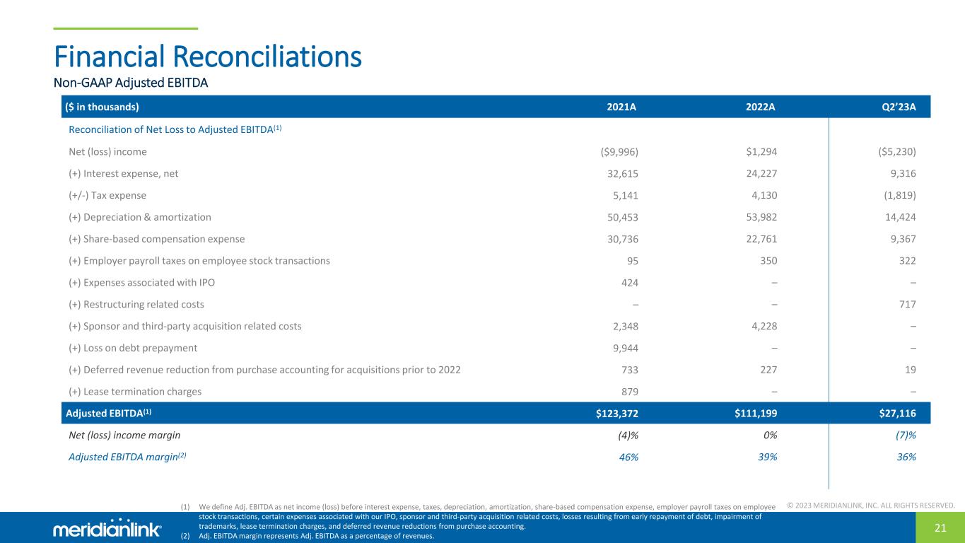 © 2023 MERIDIANLINK, INC. ALL RIGHTS RESERVED. 20 Disclaimer To supplement the financial measures presented in accordance with United States generally accepted accounting principles, or GAAP, we provide certain non-GAAP financial measures, such as adjusted EBITDA and adjusted EBITDA margin; non-GAAP operating income (loss); non-GAAP net income (loss); non-GAAP cost of revenue; non-GAAP sales and marketing expenses; non-GAAP research and development expenses; non-GAAP general and administrative expenses; and free cash flow. The presentation of these financial measures is not intended to be considered in isolation or as a substitute for, or superior to, financial information prepared and presented in accordance with GAAP. Rather, we believe that these non-GAAP financial measures, when viewed in addition to and not in lieu of our reported GAAP financial results, provide investors with additional meaningful information to assess our financial performance and trends, enable comparison of financial results between periods, and allow for greater transparency with respect to key metrics utilized internally in analyzing and operating our business. The following definitions are provided: • Non-GAAP operating income (loss): GAAP operating income (loss), excluding the impact of share-based compensation, employer payroll taxes on employee stock transactions, restructuring related costs, and sponsor and third-party acquisition-related costs. • Non-GAAP net income (loss): GAAP net income (loss), excluding the impact of share-based compensation, employer payroll taxes on employee stock transactions, restructuring related costs, sponsor and third-party acquisition-related costs, and the effect of income taxes on non-GAAP items. The effects of income taxes on non-GAAP items reflect a fixed long-term projected tax rate of 24%. The Company employs a structural long-term projected non-GAAP income tax rate of 24% for greater consistency across reporting periods, eliminating effects of items not directly related to the Company's operating structure that may vary in size and frequency. This long-term projected non-GAAP income tax rate is determined by analyzing a mix of historical and projected tax filing positions, assumes no additional acquisitions during the projection period, and takes into account various factors, including the Company’s anticipated tax structure, its tax positions in different jurisdictions, and current impacts from key U.S. legislation where the Company operates. We will reevaluate this tax rate, as necessary, for significant events such as significant alterations in the U.S. tax environment, substantial changes in the Company’s geographic earnings mix due to acquisition activity, or other shifts in the Company’s strategy or business operations. • Adjusted EBITDA: net income (loss) before interest expense, taxes, depreciation and amortization, share-based compensation expense, employer payroll taxes on employee stock transactions, restructuring related costs, sponsor and third-party acquisition related costs, and deferred revenue reductions from purchase accounting for acquisitions prior to the adoption of ASU 2021-08, “Business Combinations (Topic 805): Accounting for Contract Assets and Contract Liabilities from Contracts with Customers,” which we early adopted on January 1, 2022 on a prospective basis. As of June 30, 2023, the remaining deferred revenue from acquisitions prior to the adoption of ASU 2021-08 was less than $0.1 million, which will be recognized on a straight line basis through December 31, 2023. • Non-GAAP cost of revenue: GAAP cost of revenue, excluding the impact of share-based compensation, employer payroll taxes on employee stock transactions, and amortization of developed technology. • Non-GAAP operating expenses: GAAP operating expenses, excluding the impact of share-based compensation, employer payroll taxes on employee stock transactions, and depreciation and amortization, as applicable. • Free cash flow: GAAP cash flow from operating activities less GAAP purchases of property and equipment (Capital Expenditures) and capitalized costs related to developed technology (Capitalized Software). Reconciliations to comparable GAAP financial measures are available in the accompanying schedules, which are included in the Appendix of this presentation. No reconciliation is provided with respect to certain forward-looking non- GAAP financial measures as the GAAP measures are not accessible on a forward-looking basis. We cannot reliably predict all necessary components or their impact to reconcile such financial measures without unreasonable effort. The events necessitating a non-GAAP adjustment are inherently unpredictable and may have a significant impact on our future GAAP financial results.