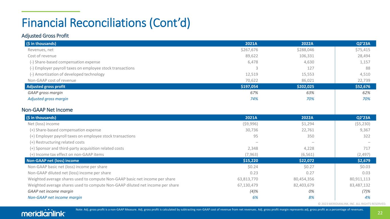 © 2023 MERIDIANLINK, INC. ALL RIGHTS RESERVED. 21 Financial Reconciliations ($ in thousands) 2021A 2022A Q2’23A Reconciliation of Net Loss to Adjusted EBITDA(1) Net (loss) income ($9,996) $1,294 ($5,230) (+) Interest expense, net 32,615 24,227 9,316 (+/-) Tax expense 5,141 4,130 (1,819) (+) Depreciation & amortization 50,453 53,982 14,424 (+) Share-based compensation expense 30,736 22,761 9,367 (+) Employer payroll taxes on employee stock transactions 95 350 322 (+) Expenses associated with IPO 424 – – (+) Restructuring related costs – – 717 (+) Sponsor and third-party acquisition related costs 2,348 4,228 – (+) Loss on debt prepayment 9,944 – – (+) Deferred revenue reduction from purchase accounting for acquisitions prior to 2022 733 227 19 (+) Lease termination charges 879 – – Adjusted EBITDA(1) $123,372 $111,199 $27,116 Net (loss) income margin (4)% 0% (7)% Adjusted EBITDA margin(2) 46% 39% 36% (1) We define Adj. EBITDA as net income (loss) before interest expense, taxes, depreciation, amortization, share-based compensation expense, employer payroll taxes on employee stock transactions, certain expenses associated with our IPO, sponsor and third-party acquisition related costs, losses resulting from early repayment of debt, impairment of trademarks, lease termination charges, and deferred revenue reductions from purchase accounting. (2) Adj. EBITDA margin represents Adj. EBITDA as a percentage of revenues. Non-GAAP Adjusted EBITDA